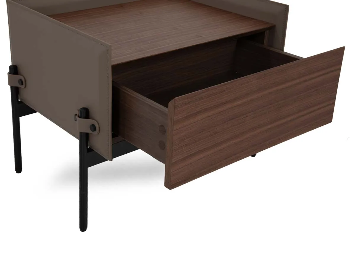 Boasting a brown veneer table top, one single drawer for storage & faux leather sides with metal frame & legs, this retro Bonair locker is a must have piece.