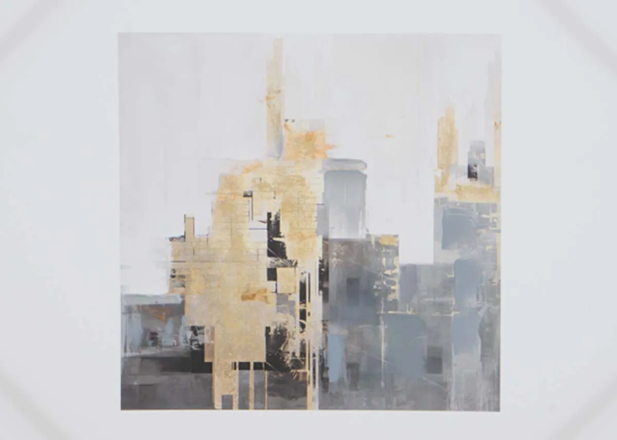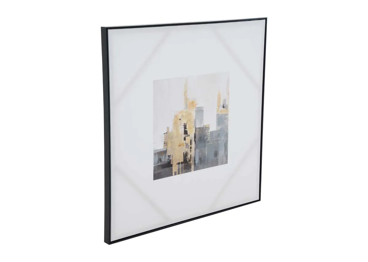 A moody picture of rooftops in muted tones of grey gold and white will bring instant city vibes into your home.