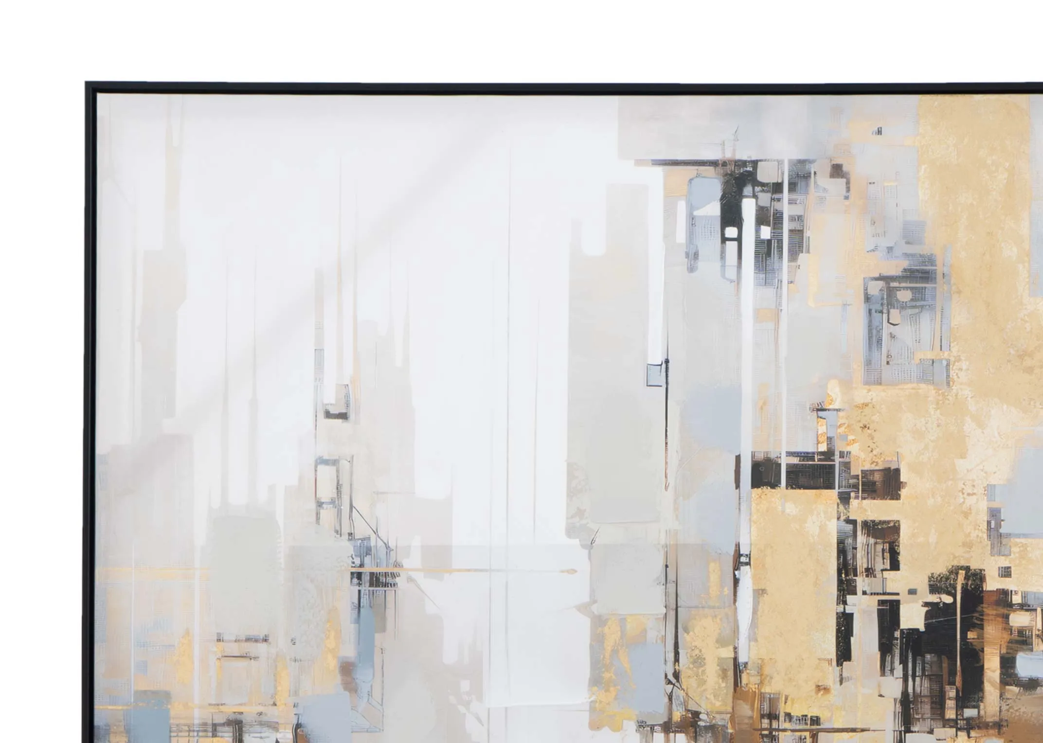 A moody citys industrial rooftops with a bridge and river in muted tones of grey gold and white will bring instant city vibes into your home.
