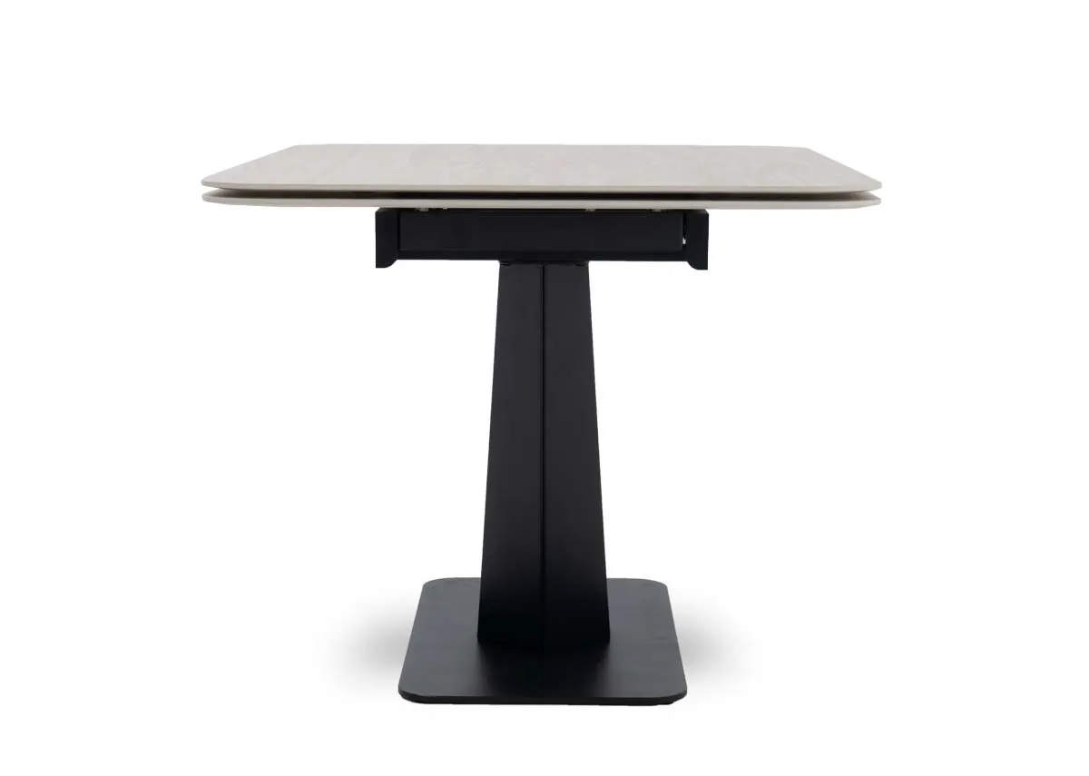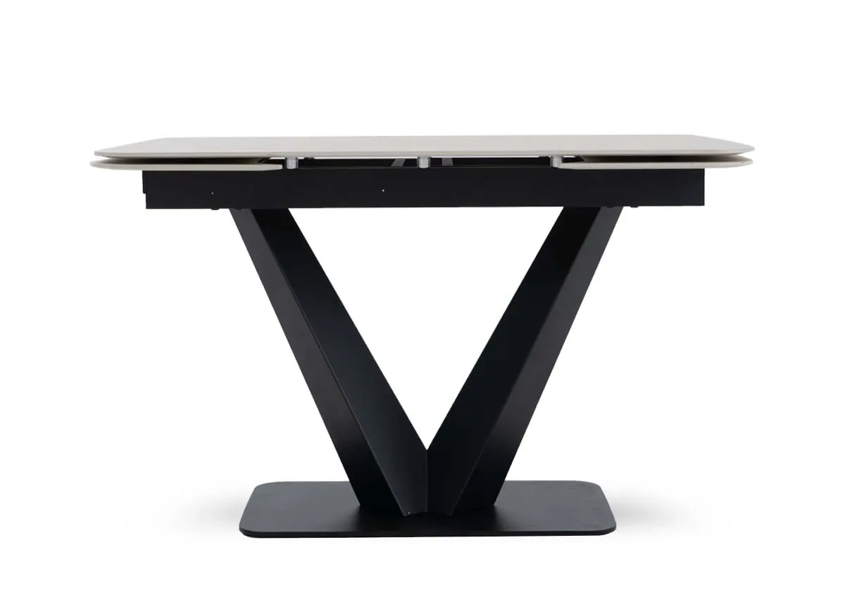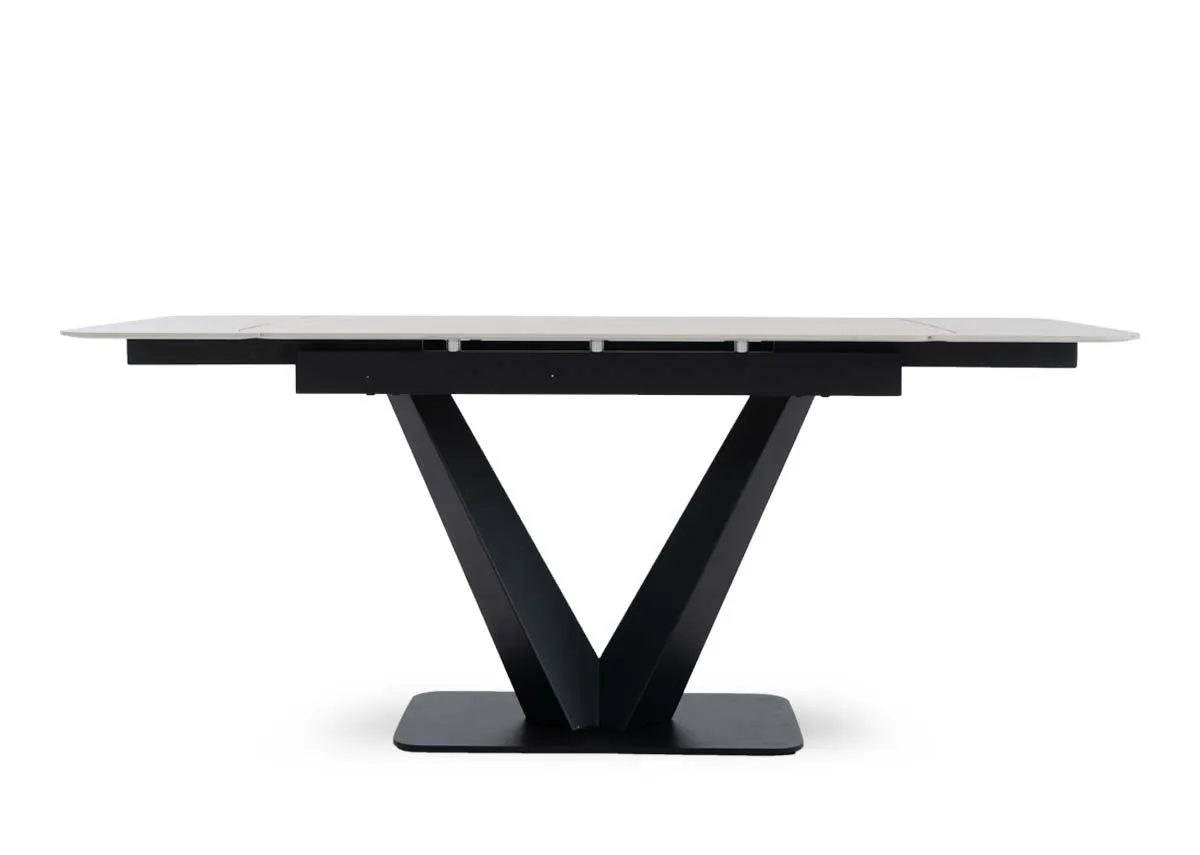 A slick double extendable dining table with a cream ceramic top, modern, versatile and the perfect fit for your dining space.