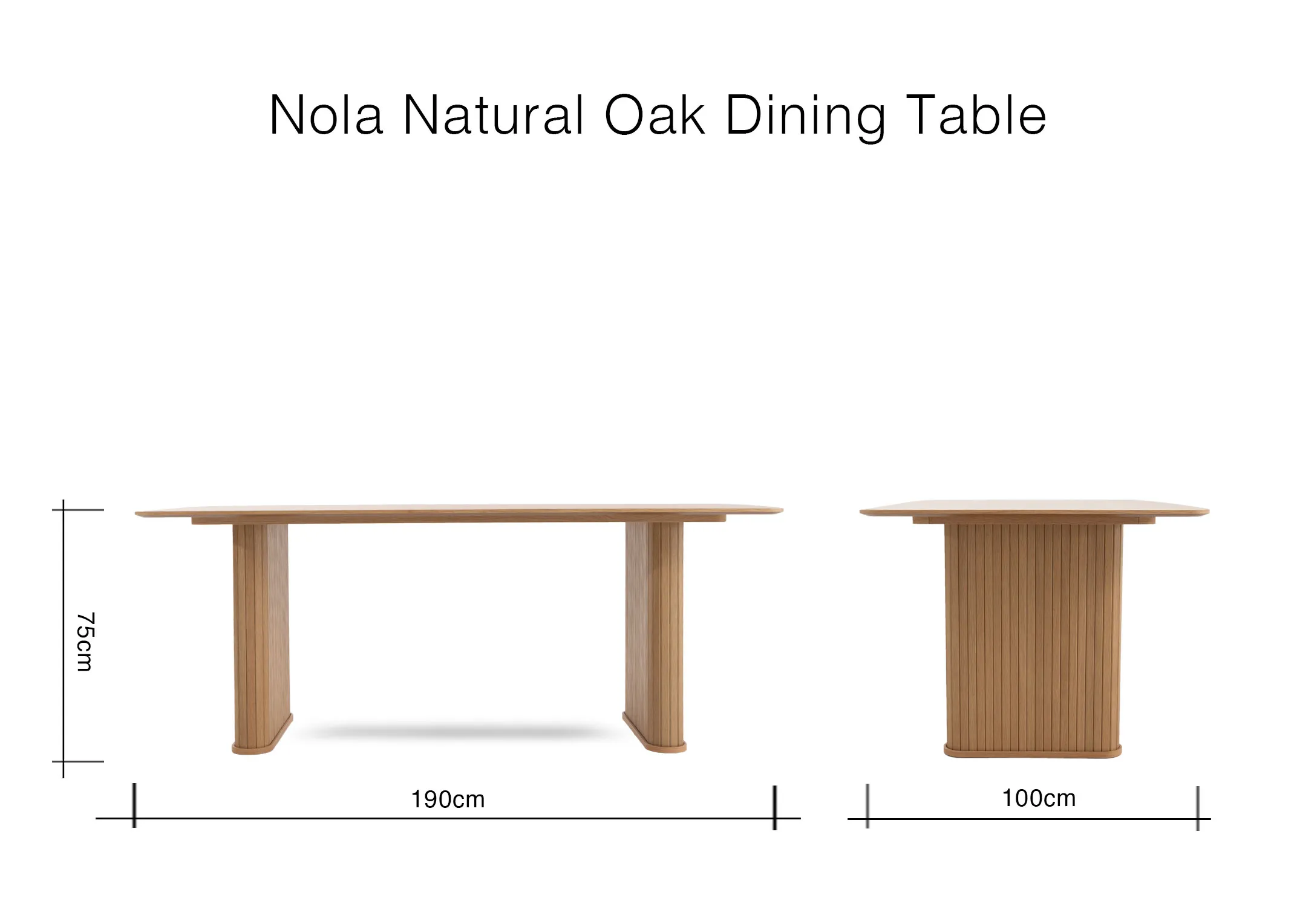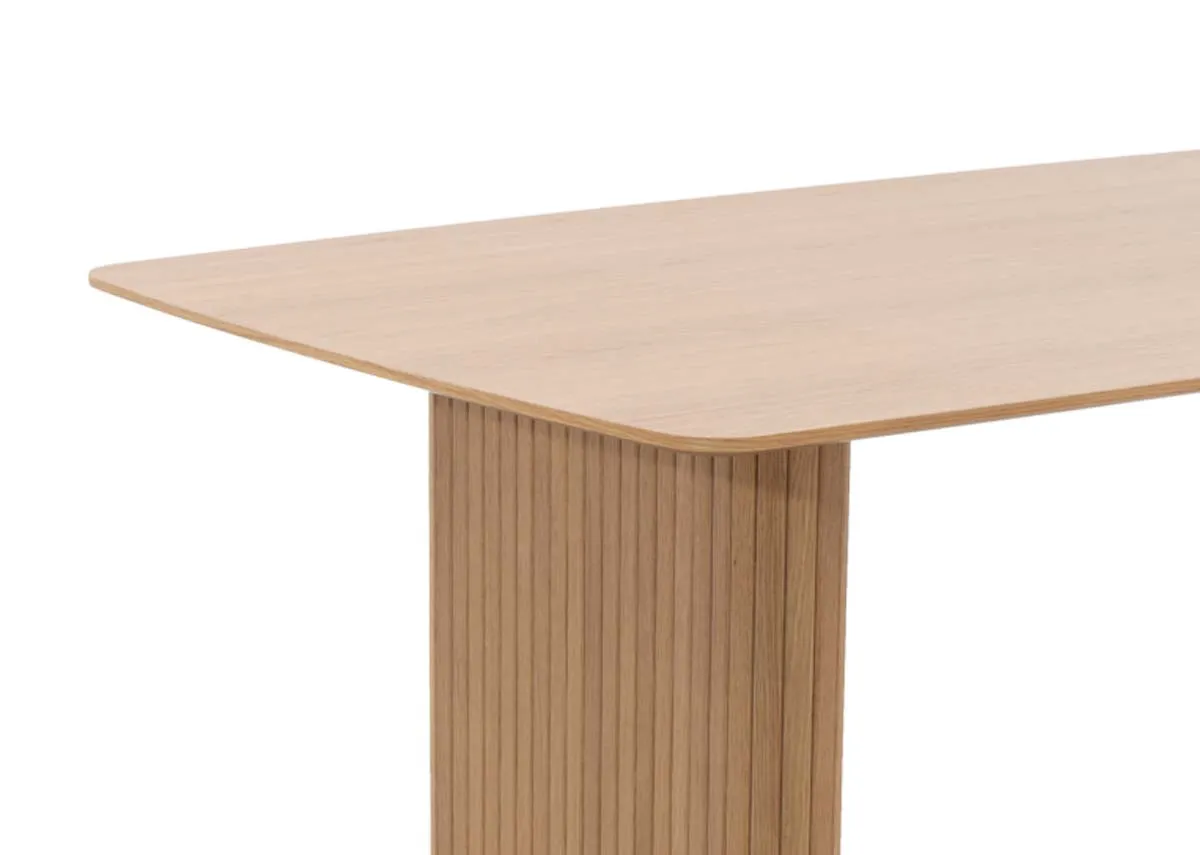 A mid century inspired design this Nola oak dining table has a pedestal slat wood base and veneer finish, ideal for most dining spaces.