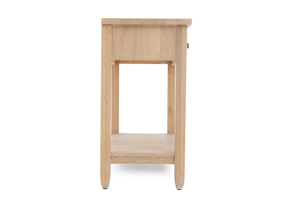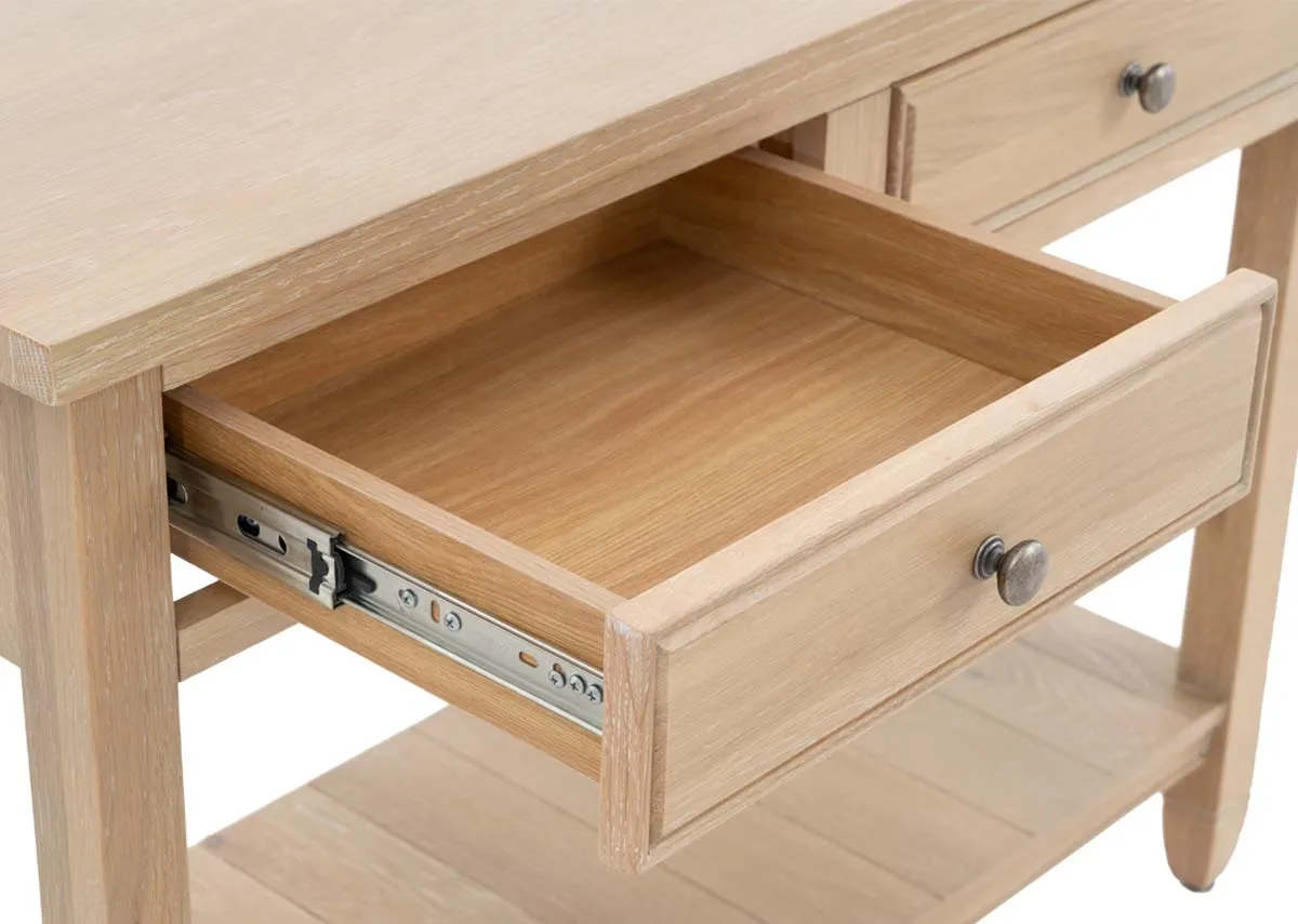 An oak console table with chunky oak top, a lower shelf for display and 2 drawers for storage, perfect for the hallway.