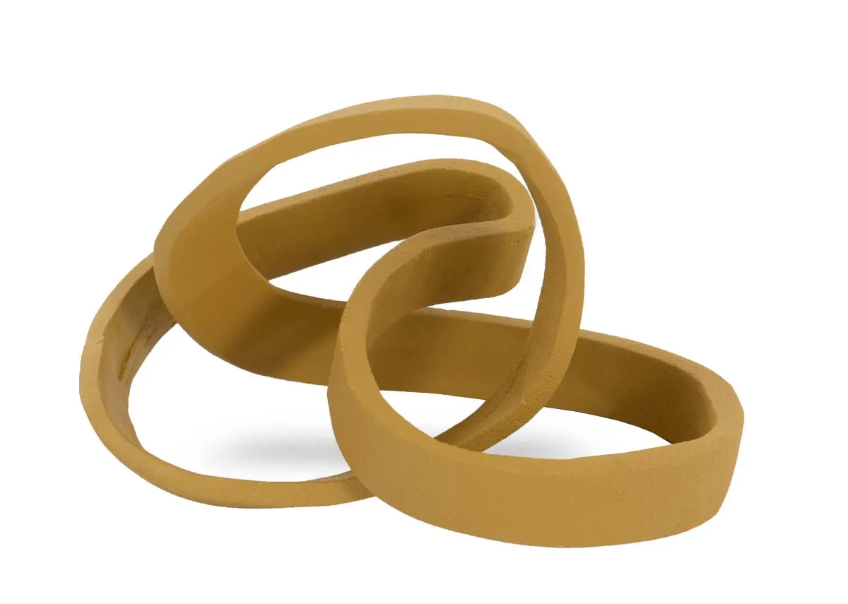 This links ornament has 2 pieces of metal in a mustard finish linked together, display on a coffee table or bowl