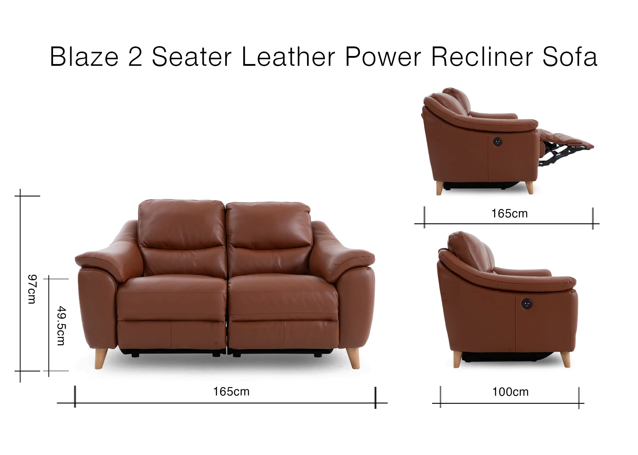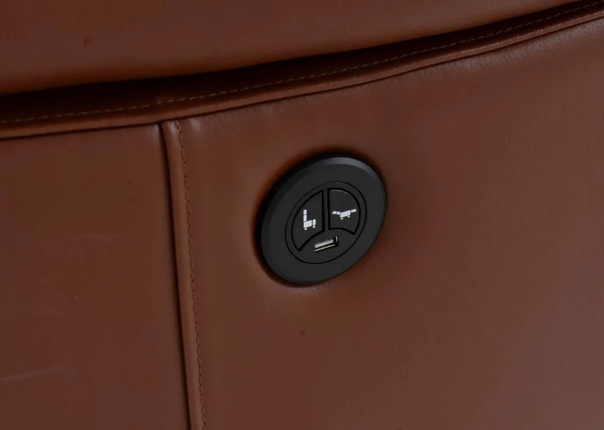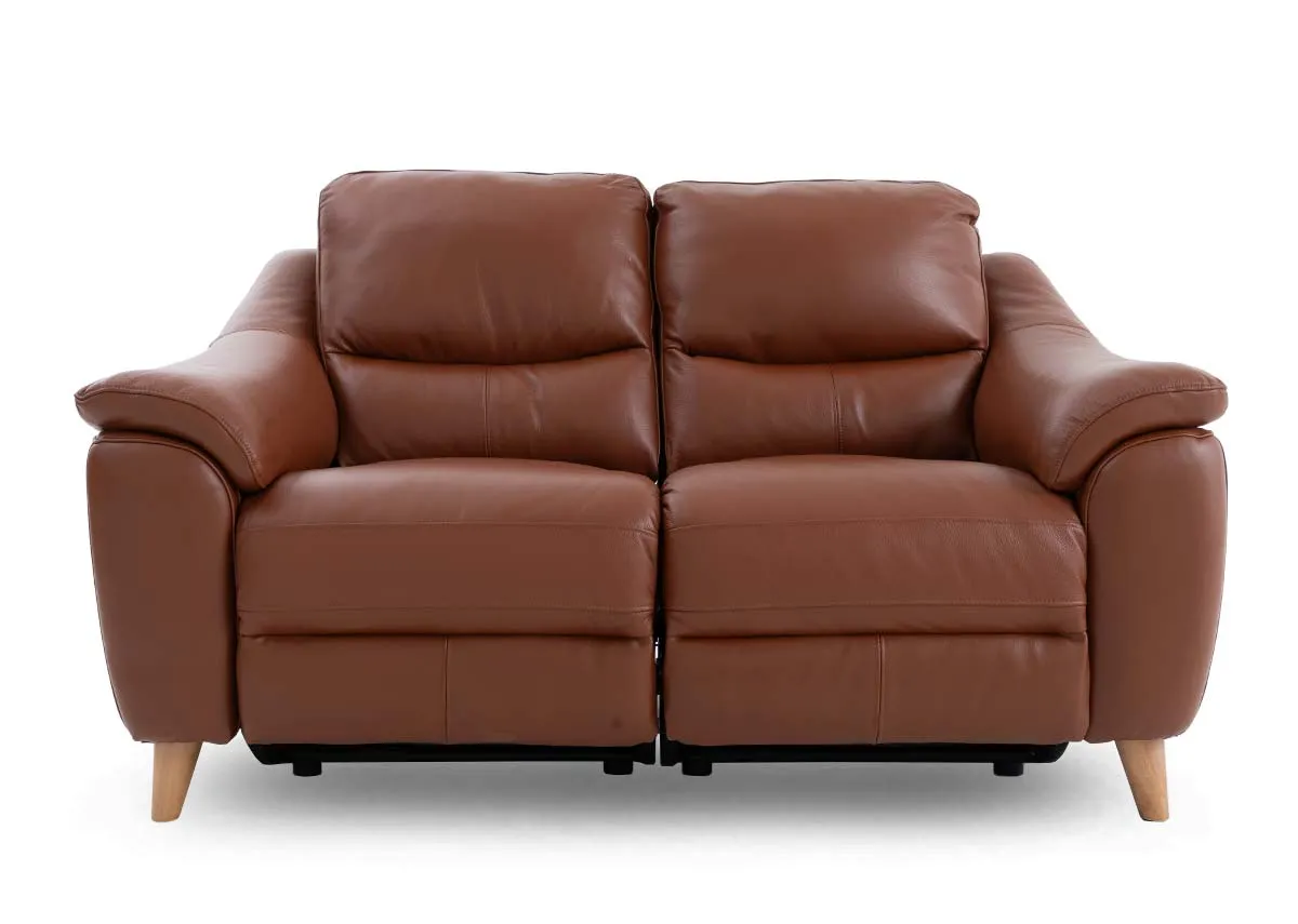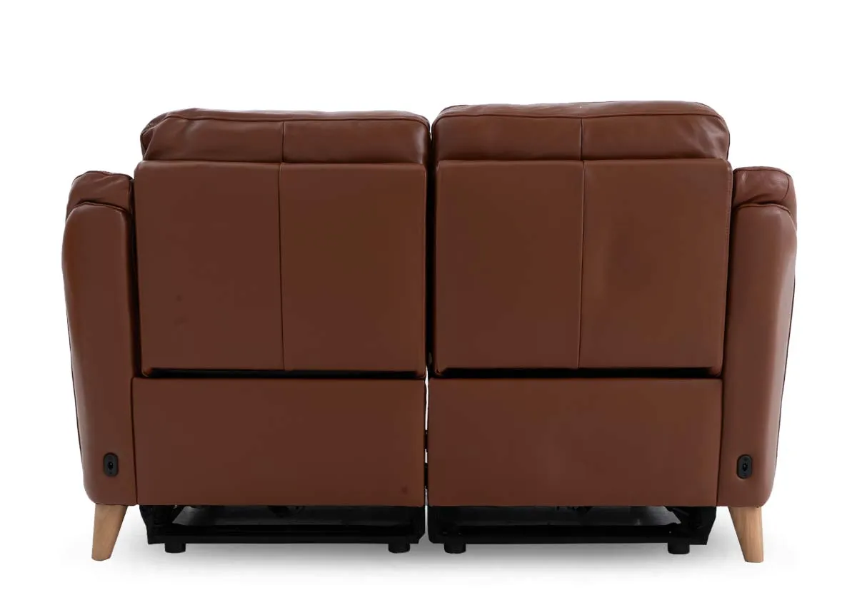 A tan brown soft leather 2 seater sofa with power reclining & usb function, cushions made of high-density foam & supported by pocket springs.