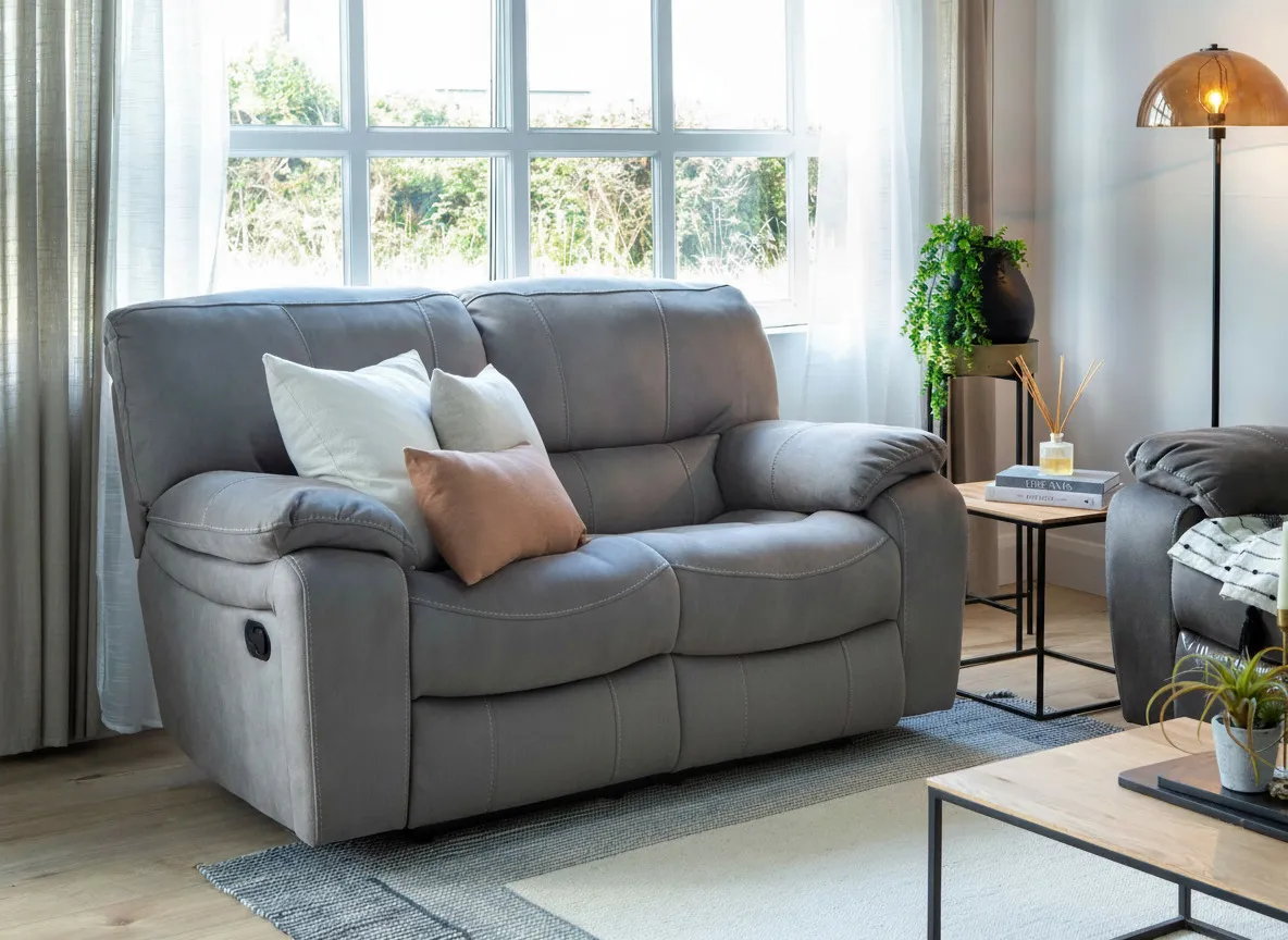 Relax in plush comfort with this grey faux-suede recliner 2-seater sofa. Easy to clean and stylish, it offers effortless relaxation.