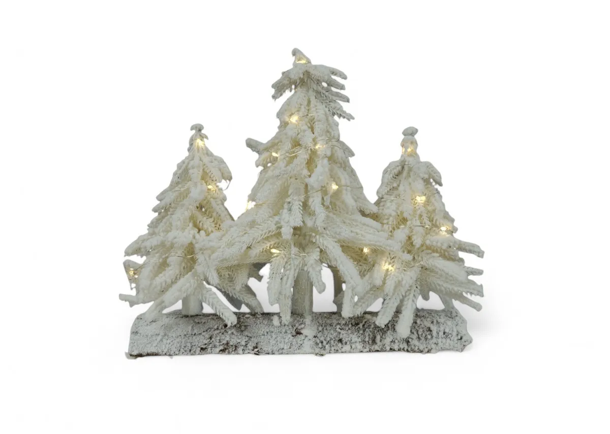 This gorgeous Elsie 26cm Snow Ornament with lights displays 3 small seasonal pine trees with a snowy finish on a wood base.