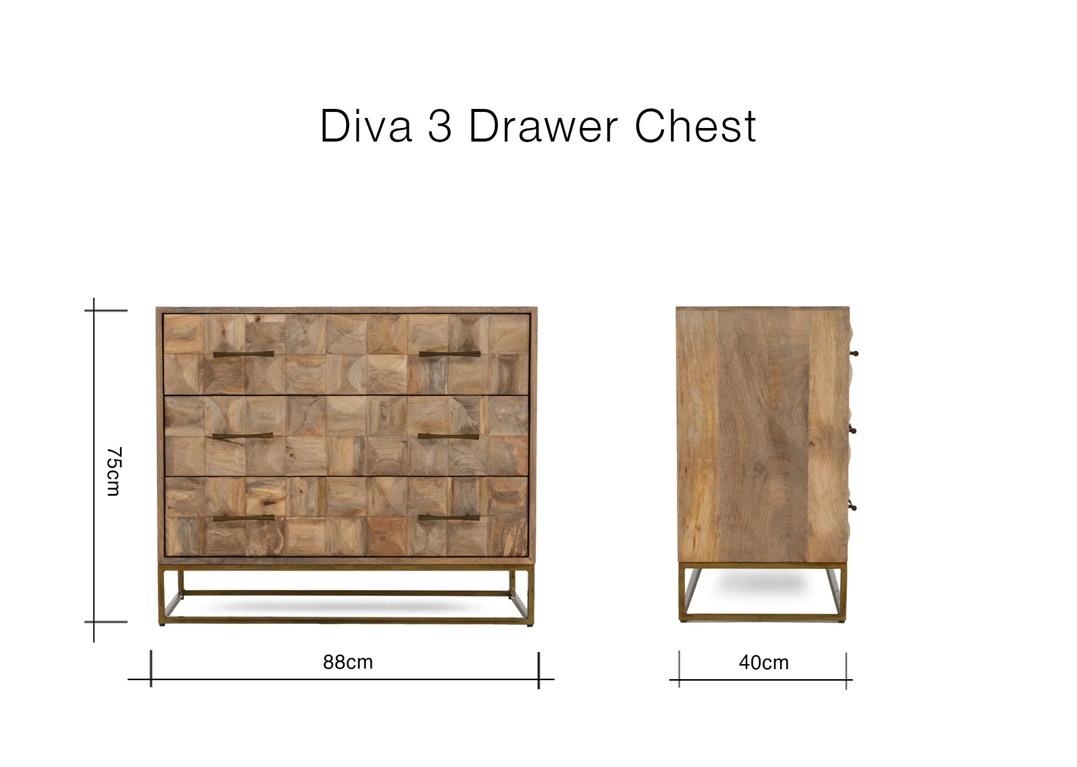 Stunning in mango wood the Diva 3 drawer chest boasts a mosaic design which will add texture to your chosen space.