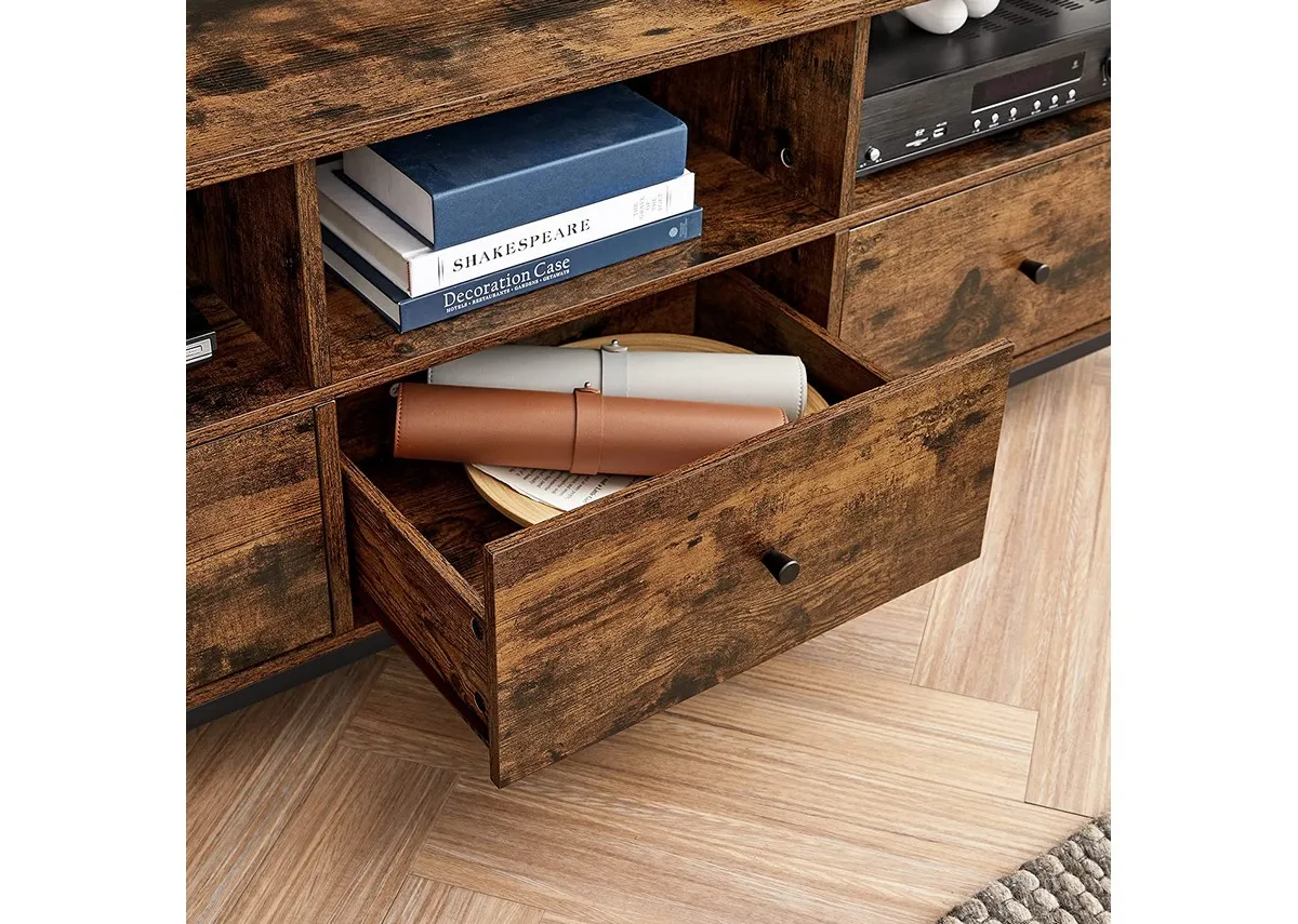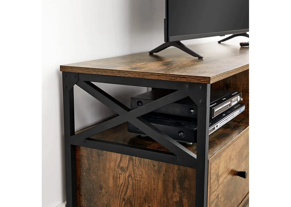 A rustic wood and black metal TV stand with open and closed storage, suitable for a variety of entertainment rooms.
