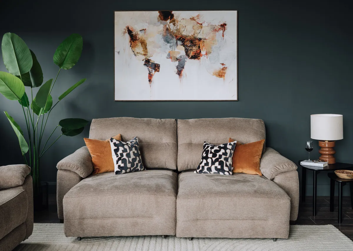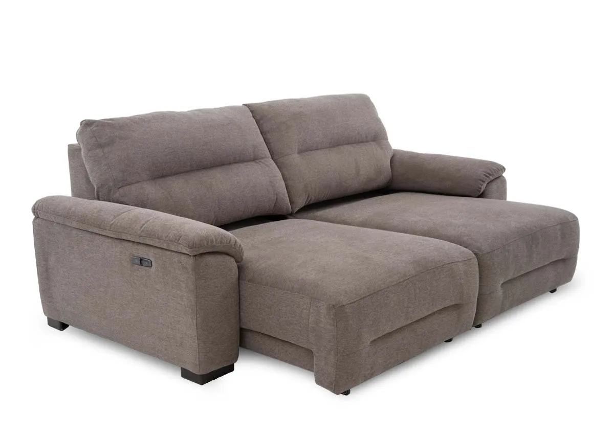 A comfy brown fabric 3 seater sofa that can be a one side chaise or cinmea chaise all with the touch of a button.