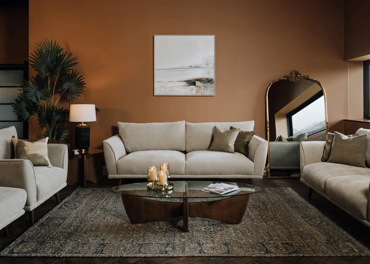 A 3 seater wide sofa upholstered in a silver with dark feet, retro in style.
