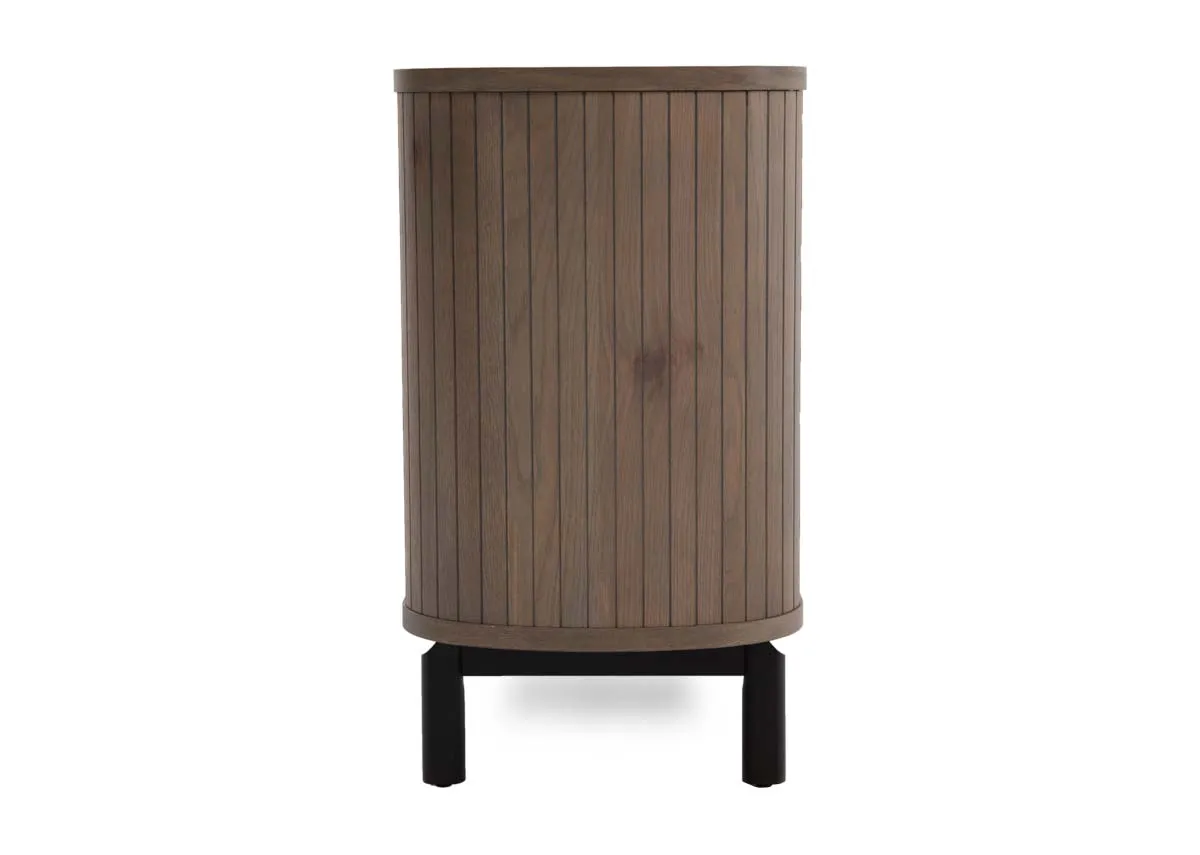 A curved wide sideboard with 4 doors and 2 discreet drawers all boasting grey oiled veneer and wire brushed oak finish with metal legs.