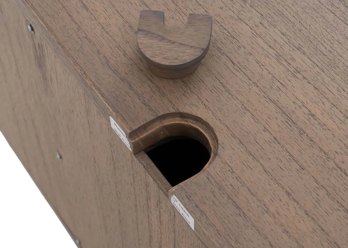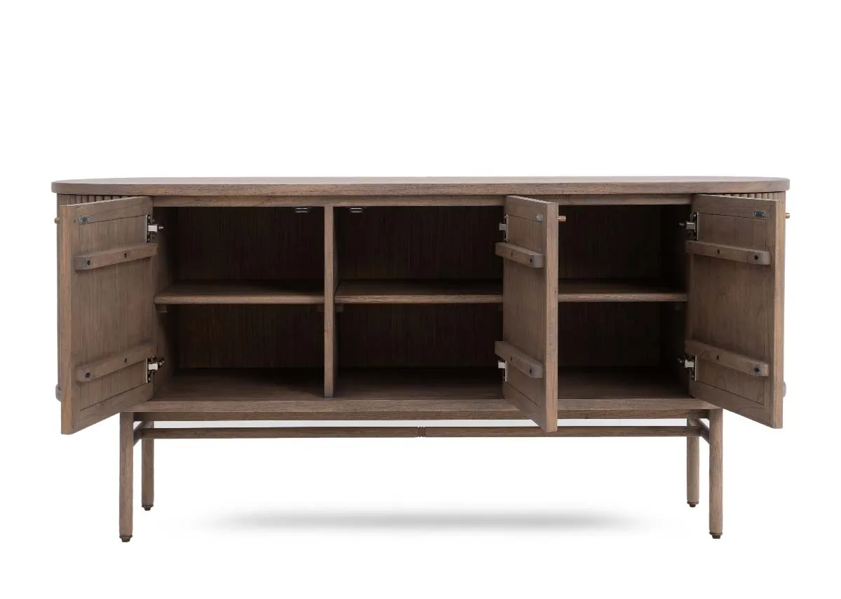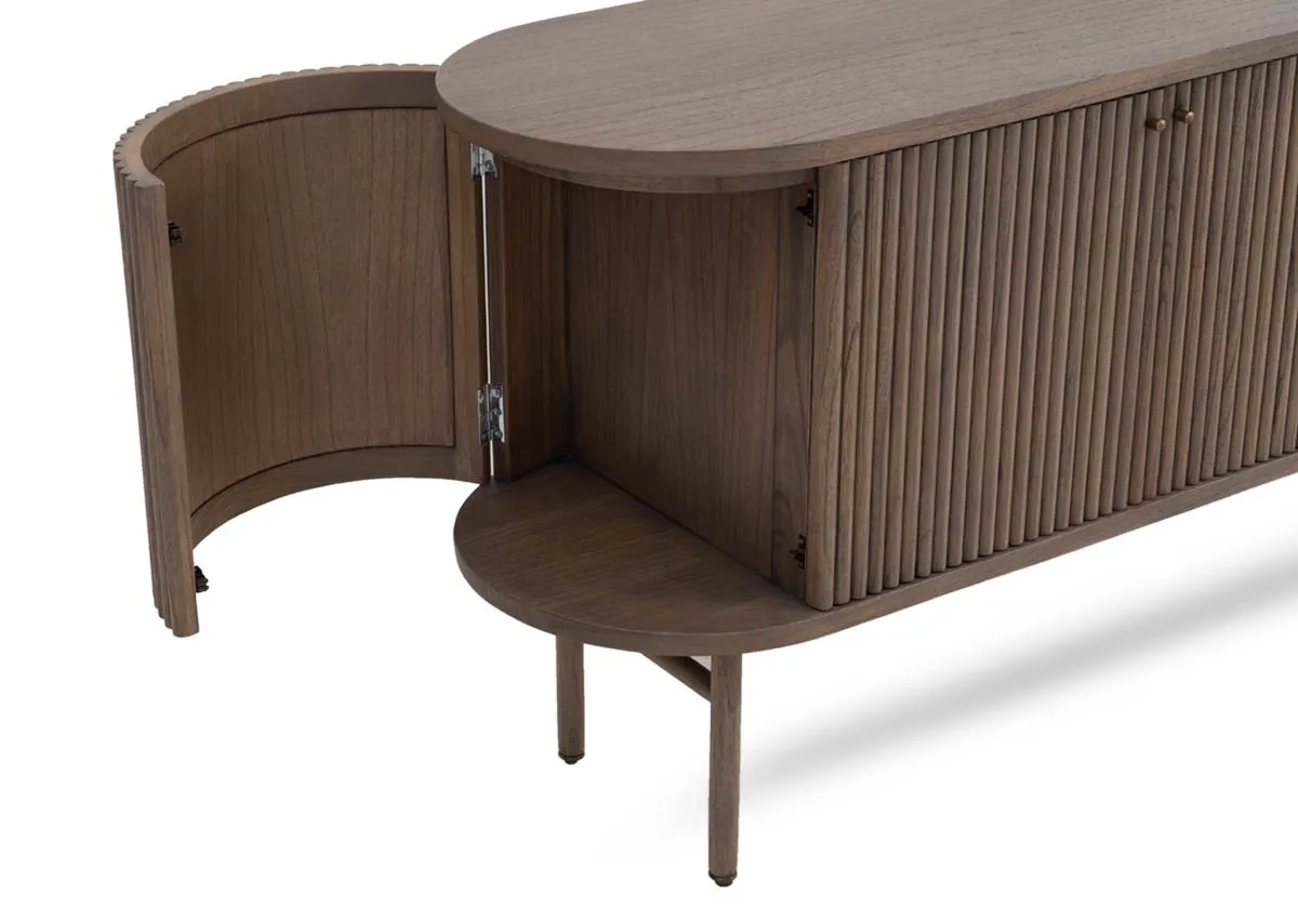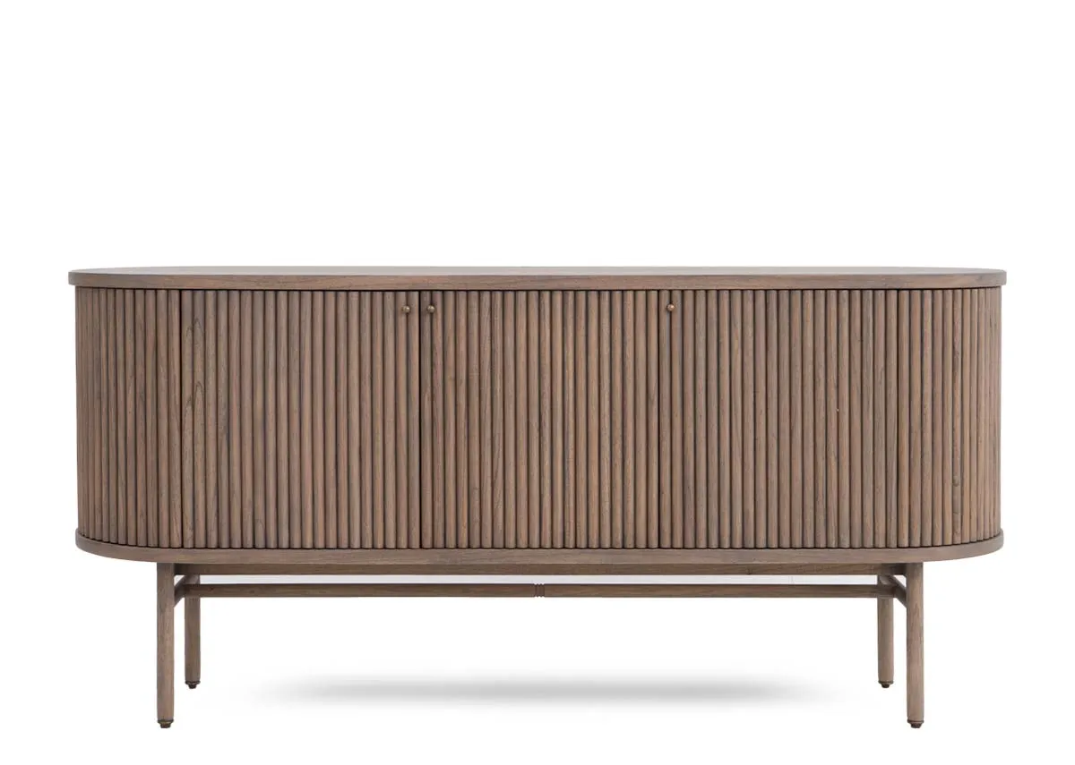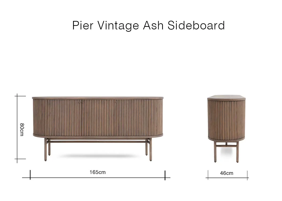 Boasting a vintage ash color the Pier sideboard has a slatted finish, pleasing curves, and a handy side door for your liquor or valuables.