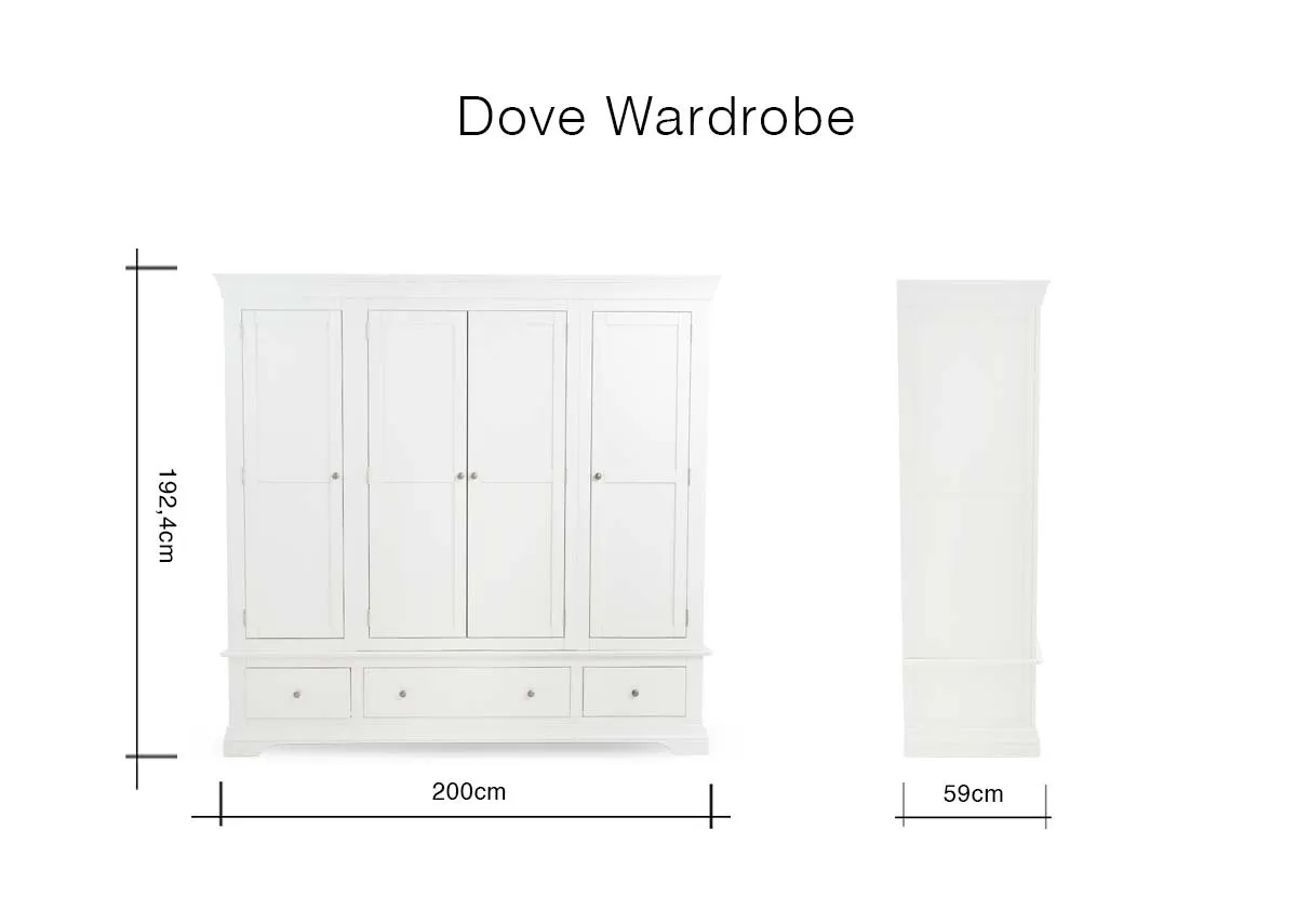A 4 door white pine wardrobe with painted finish, 3 drawers provide storage alongside ample hanging space.
