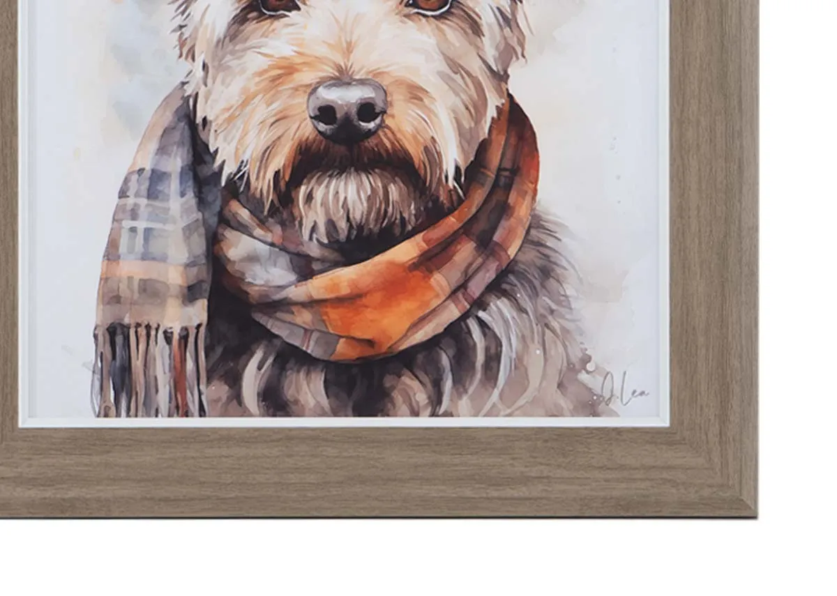 A framed portrait of Teddy a cheeky Airedale terrier dog wearing a scarf, the ideal piece for a dog lover.