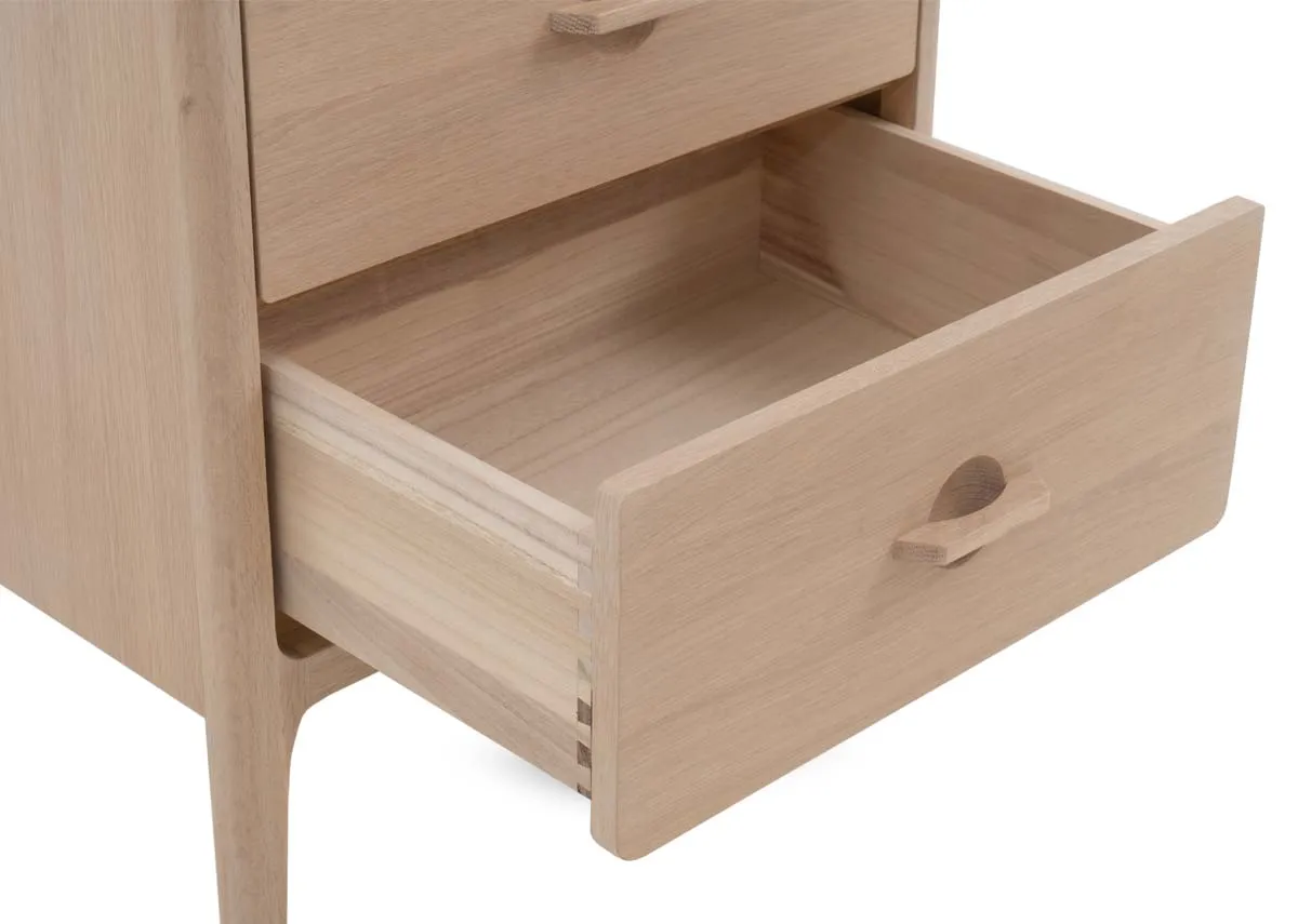 Introduce elegant organisation and natural charm to your bedroom with the Jay 5 Drawer Tallboy, featuring a beautiful white oak finish and smooth soft-close drawers.