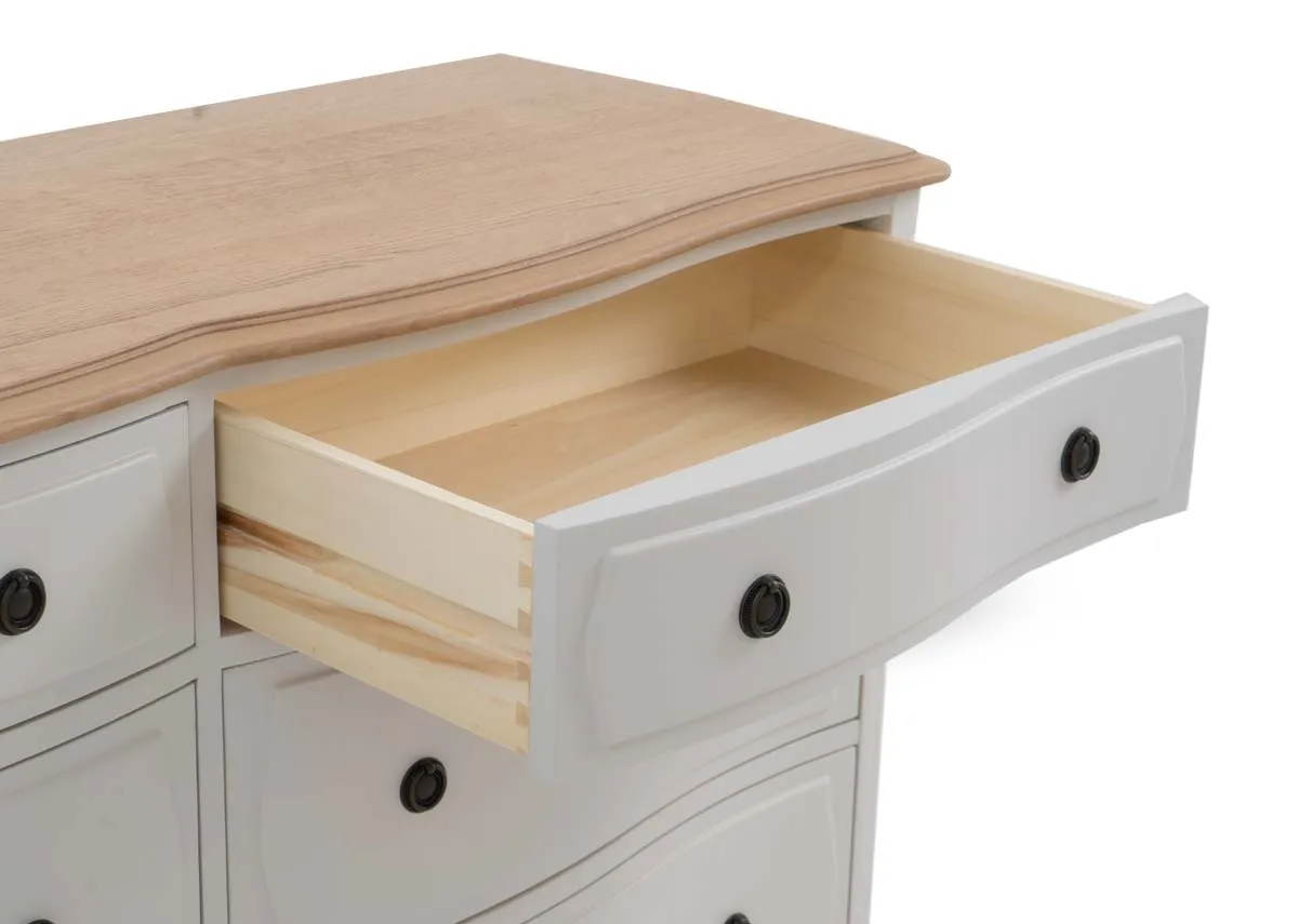 Discover the Amelie 6 Drawer Dresser, a beautiful fusion of classical French joinery and ample storage, presented in a delightful white and limewashed oak.