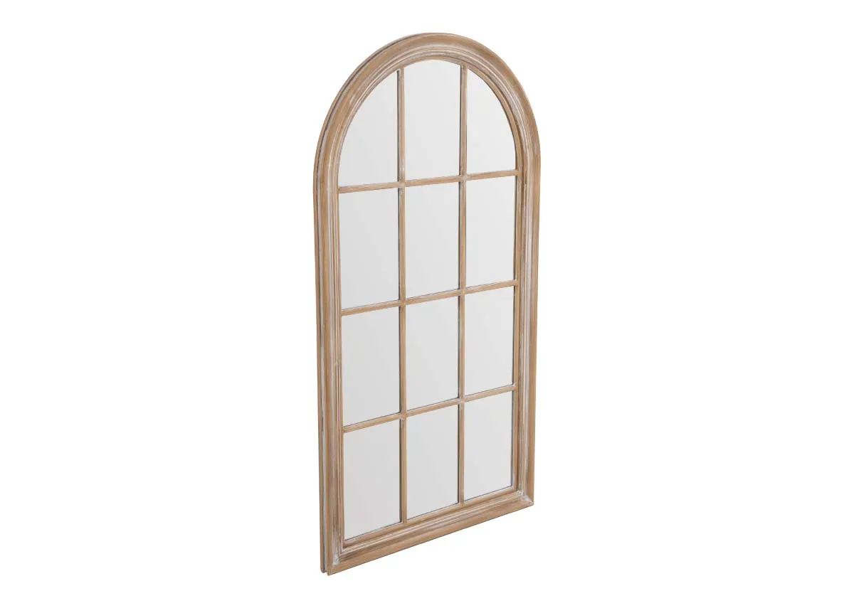 A window pane inspired mirror, arched and trimmed in a rustic wood finish, ideal for a hallway, living or bedroom.