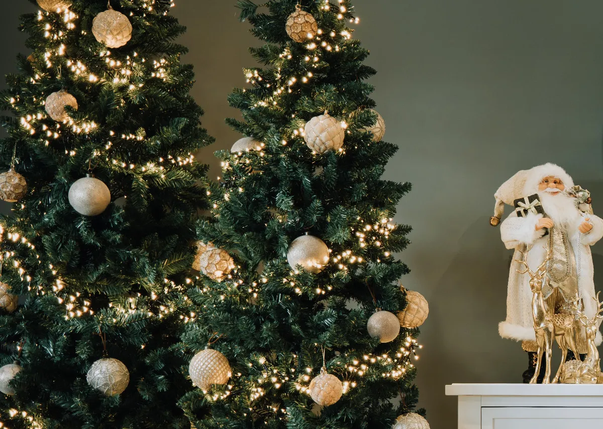 A set of four light brown 8cm glass baubles with a stunning glitter trellis pattern.