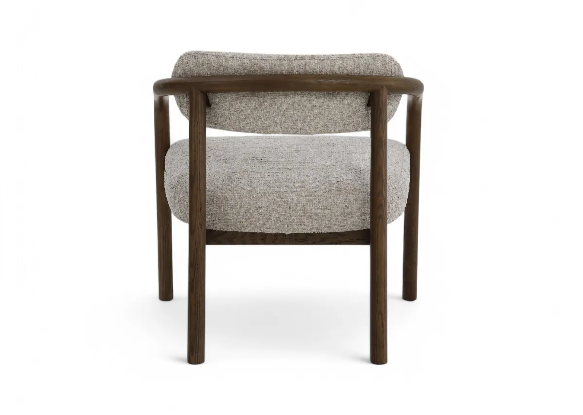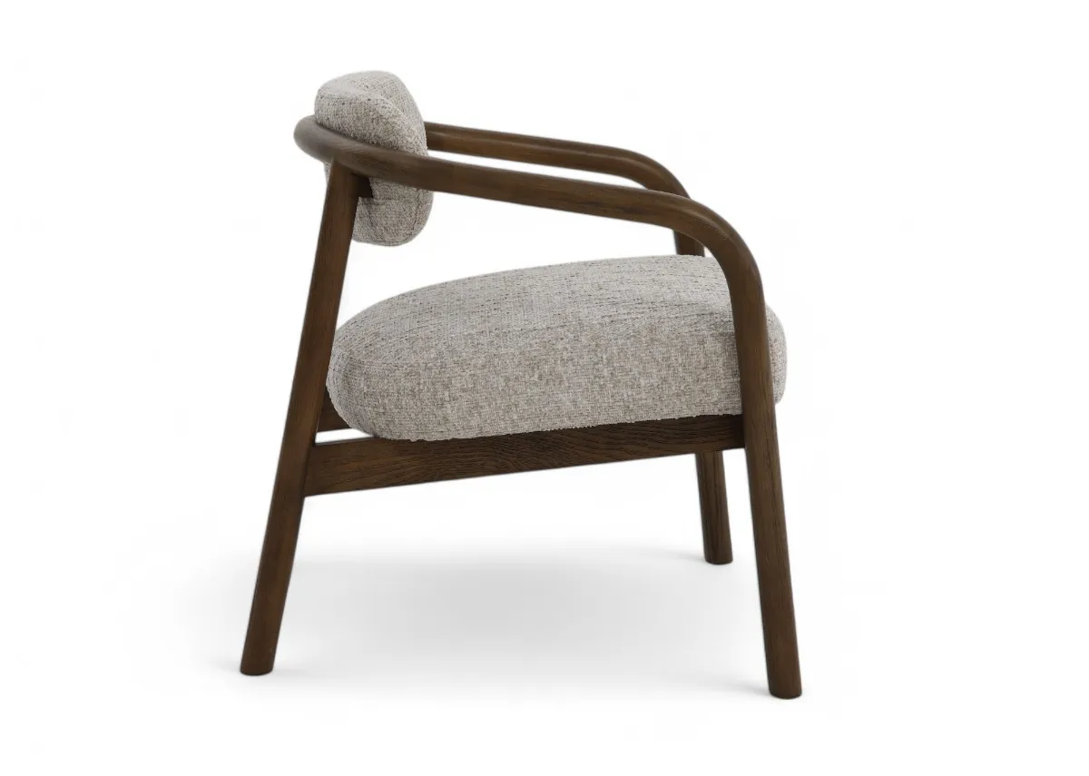 An oak framed accent chair with curved armrests and a beige padded seat and backrest ideal for the corner of any room in the house.