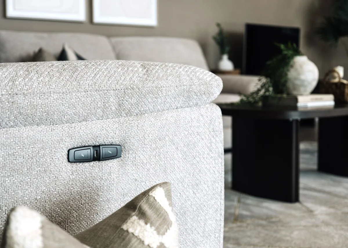 A light beige fabric swivel recliner with manual side lever, the perfect armchair for traditional homes with a contemporary twist.