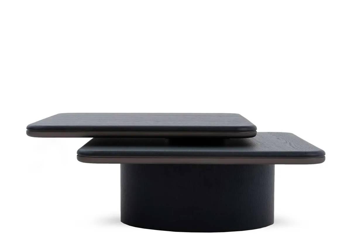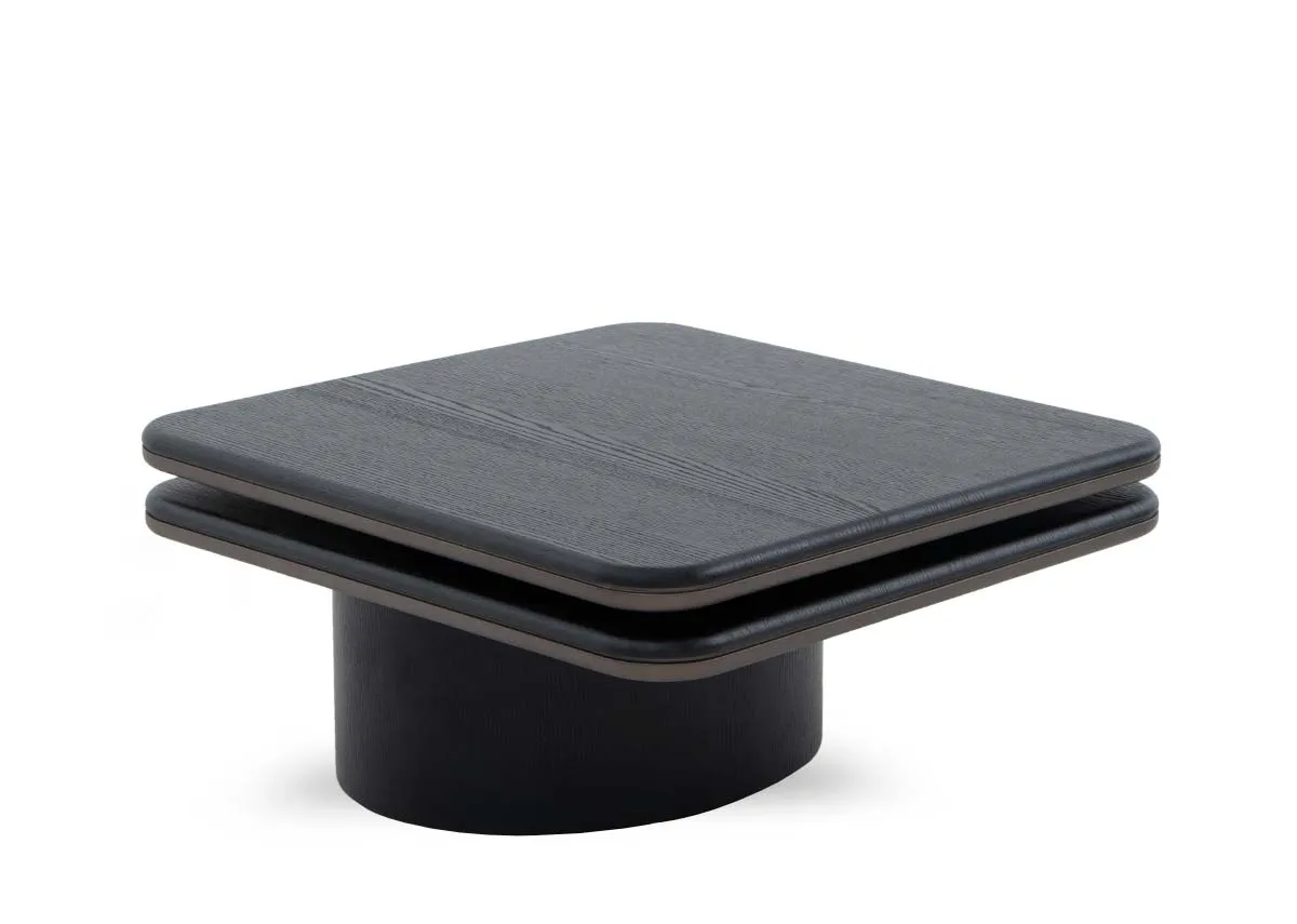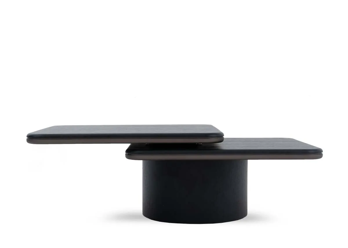 a black and brown coffee table, sleek in style and swivel in design giving you alternate options from square to double sided.