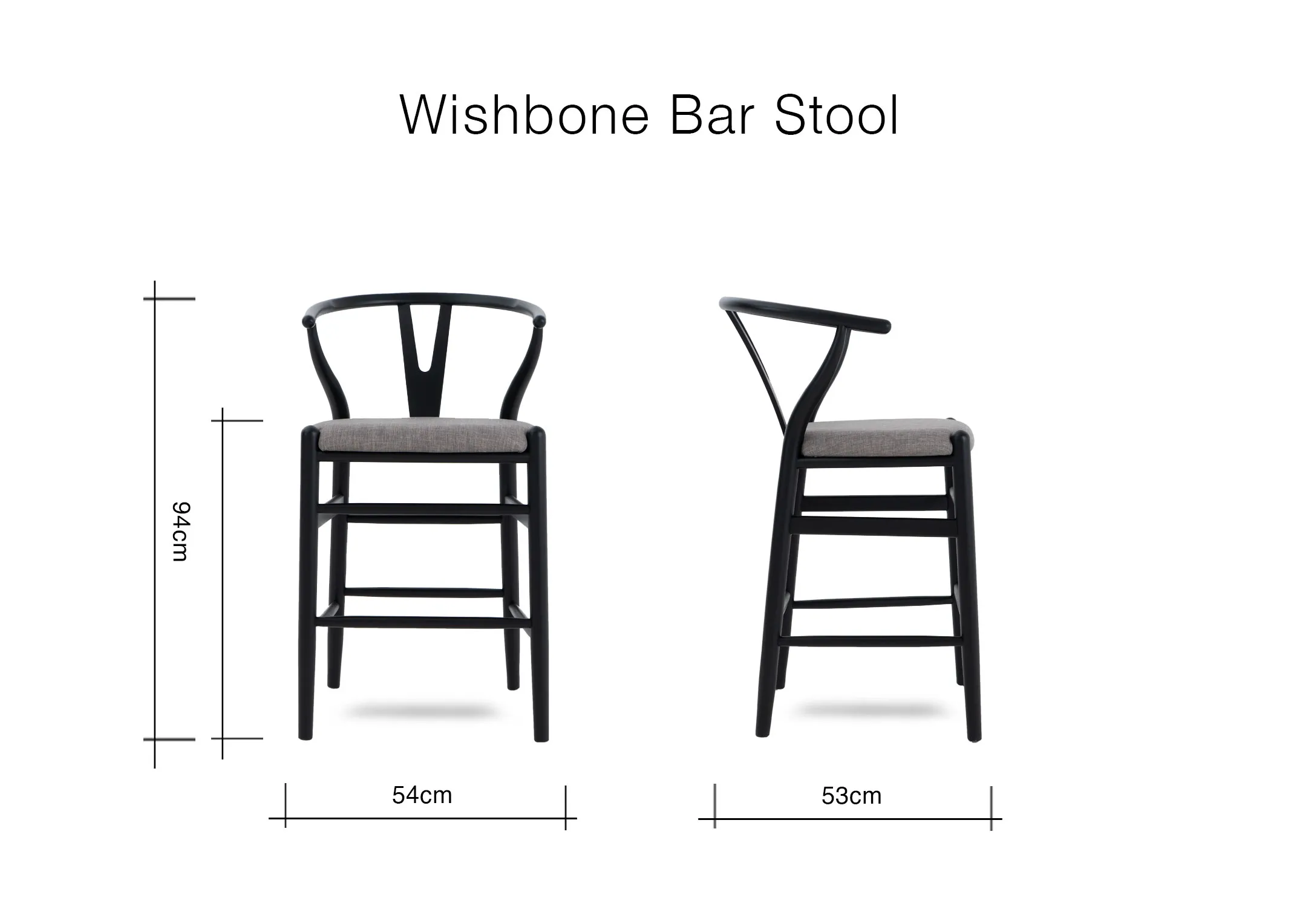 A black wishbone frame bar stool with a grey upholstered padded seat cushion gives this piece its worthy name.