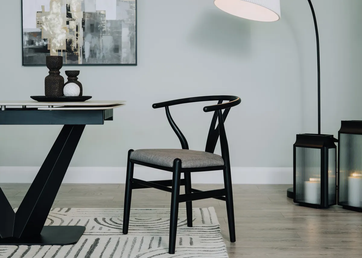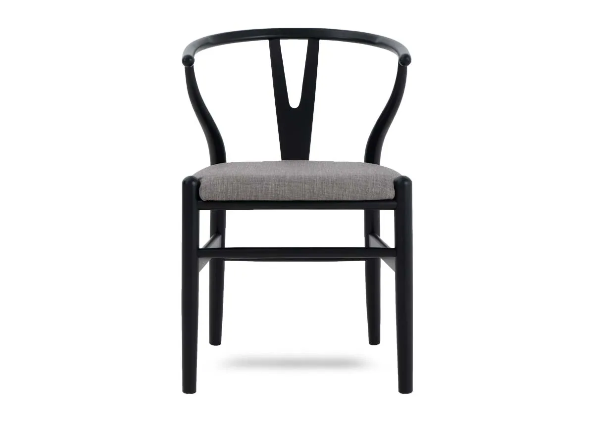 A black wishbone frame dining chair with a grey upholstered padded seat cushion gives this dining chair its worthy name.