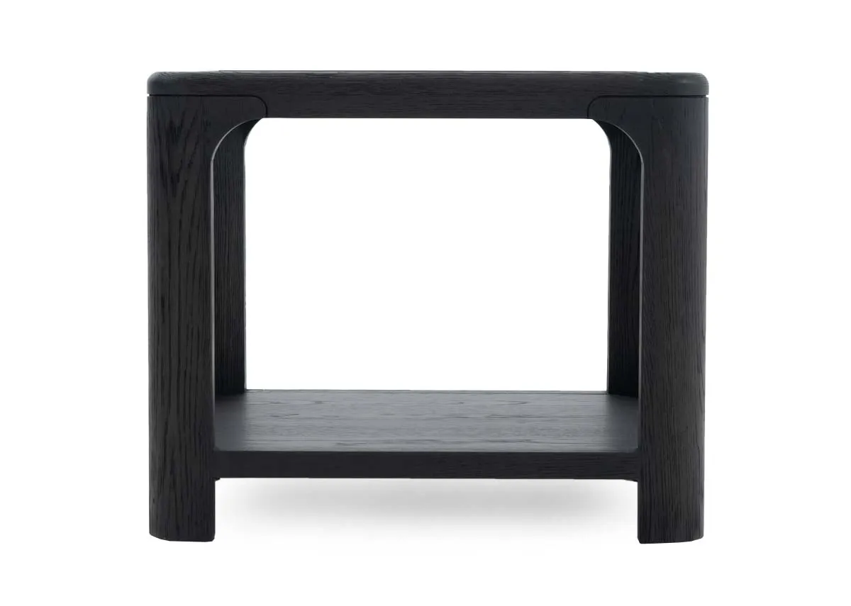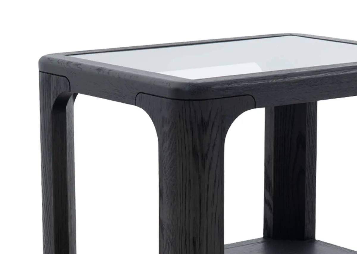 A square lamp table with black painted oak frame and lower shelf with a glass top, a versatile piece beside any sofa.