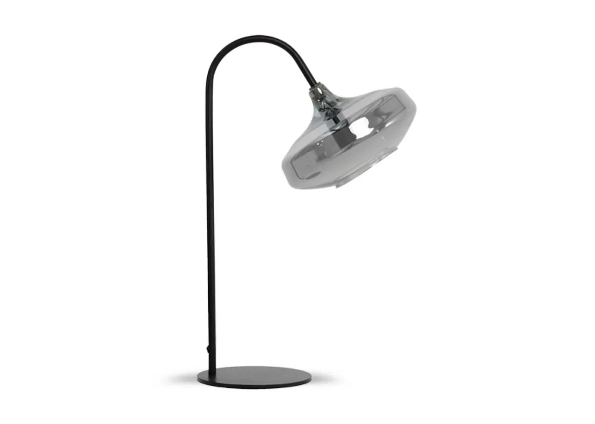 A black metal table lamp with smoked grey glass wide bulb shade.