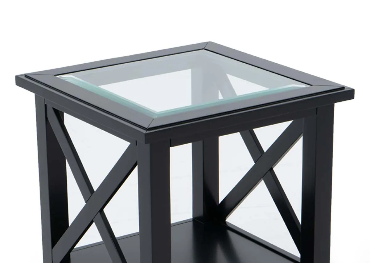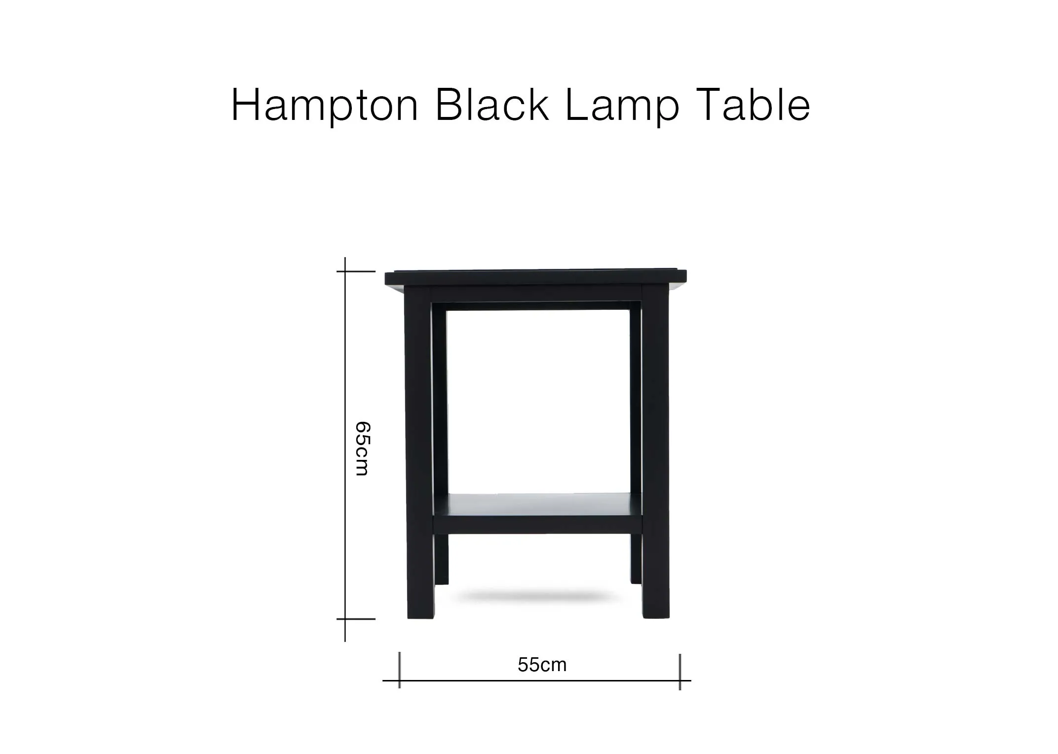 The Hampton black lamp table has a pine frame and a glass top with 3 small drawers for storage and ample shelf storage underneath.