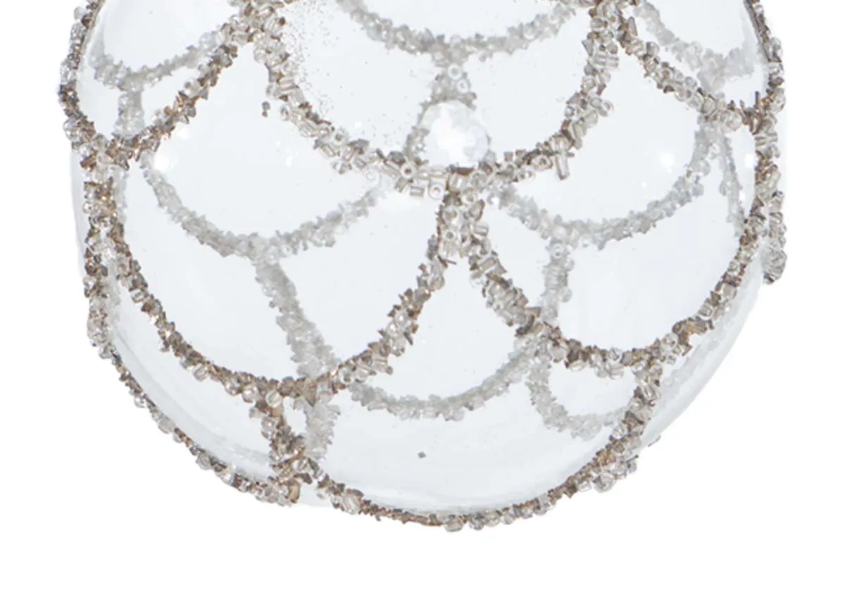 A clear glass bauble with silver beaded embellishments in a scalloped design.