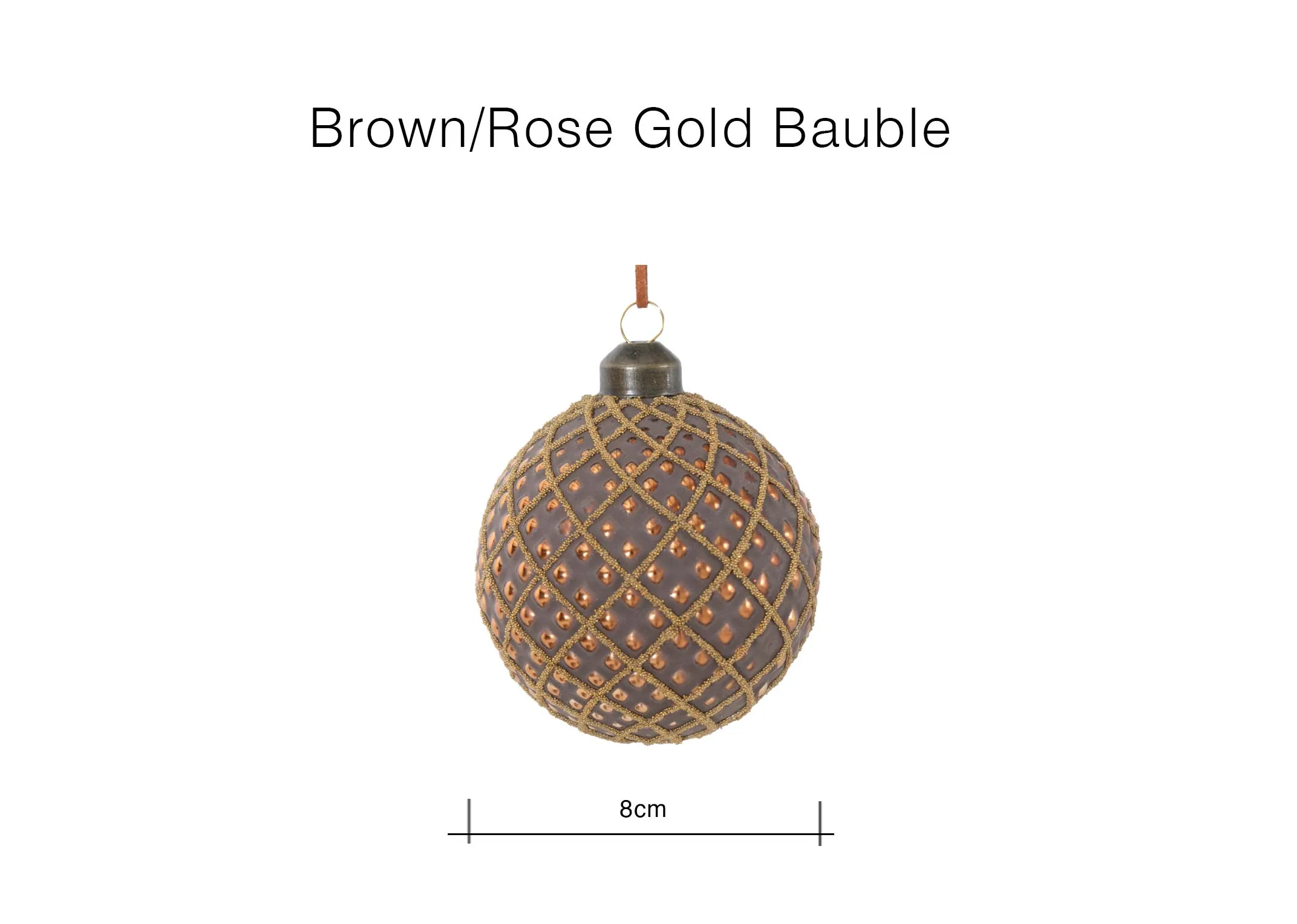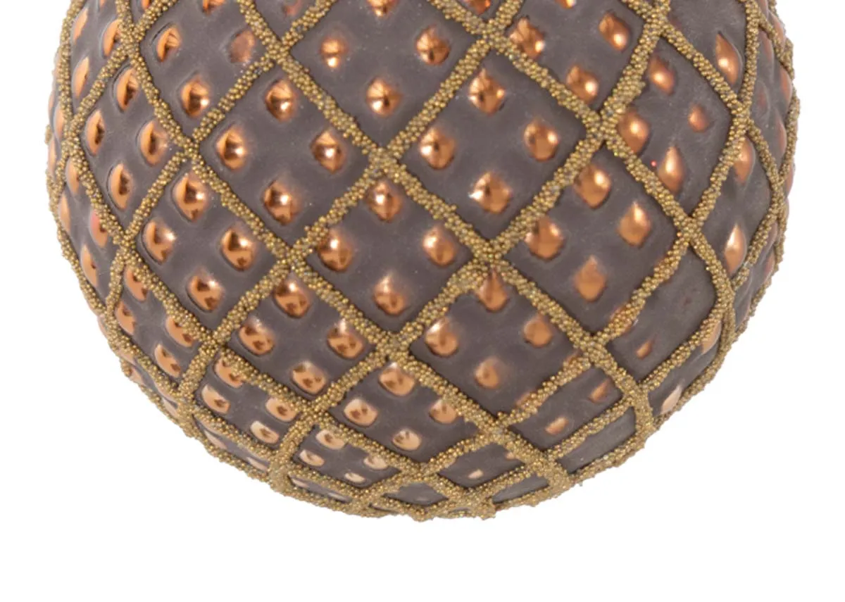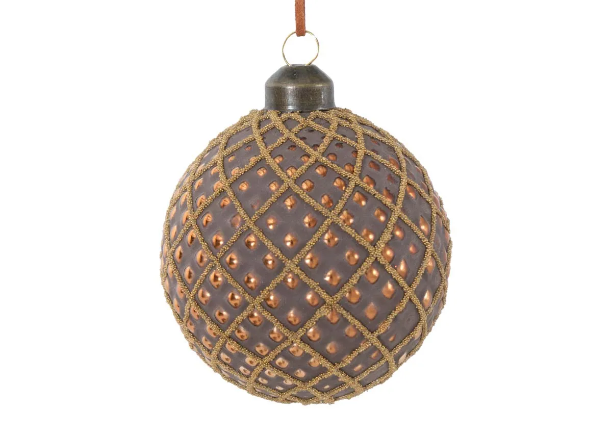 A rich brown-coloured bauble with rose gold embellishments and a gold beaded diamond pattern, finished with a bronze crown.