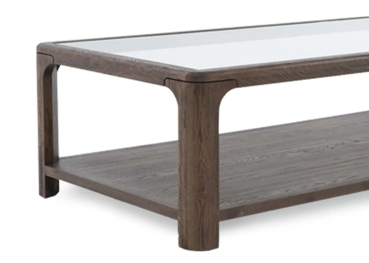 A rectangular coffee table with dark wood frame and lower shelf with a glass top, a versatile piece for any sofa.
