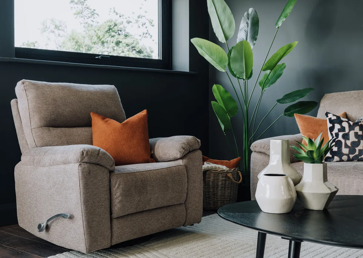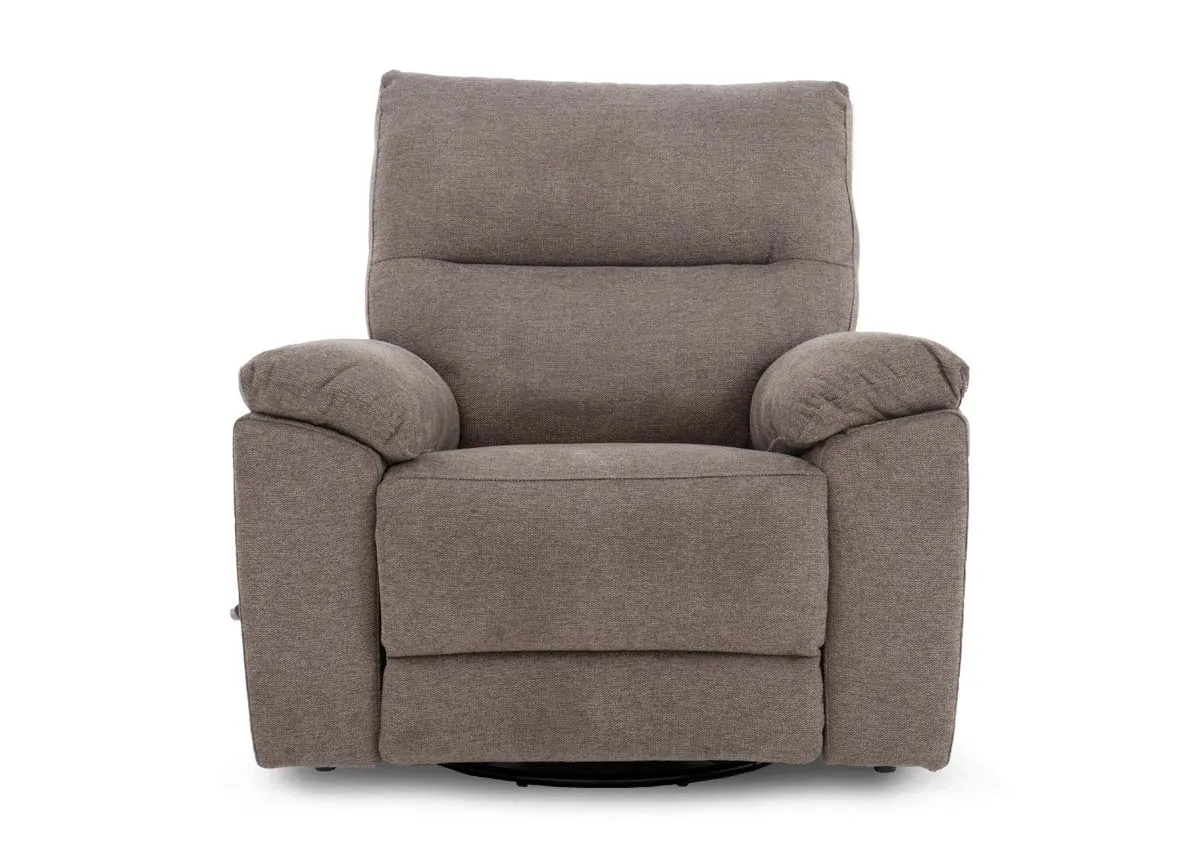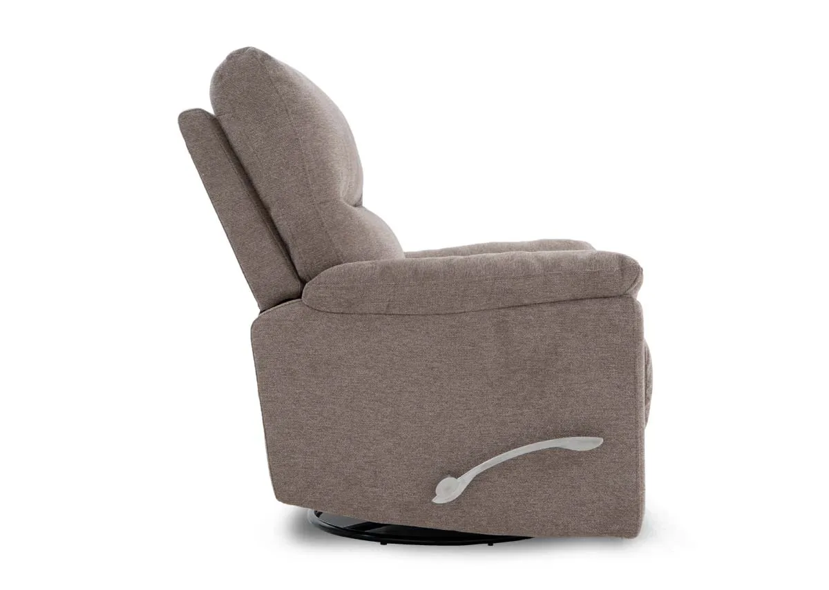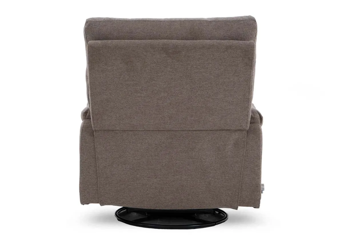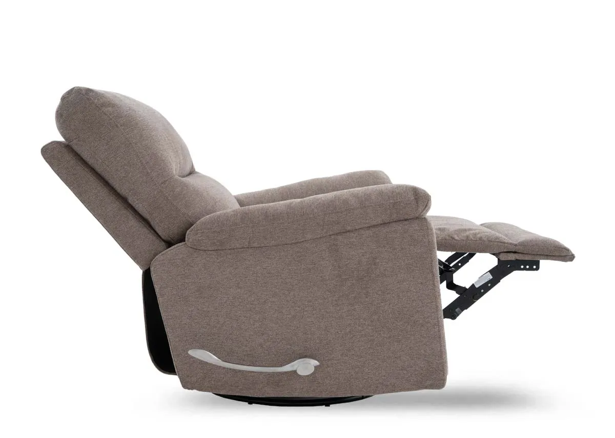 A comfy brown fabric swivel recliner with manual side lever, the perfect armchair for traditional homes with a contemporary twist.