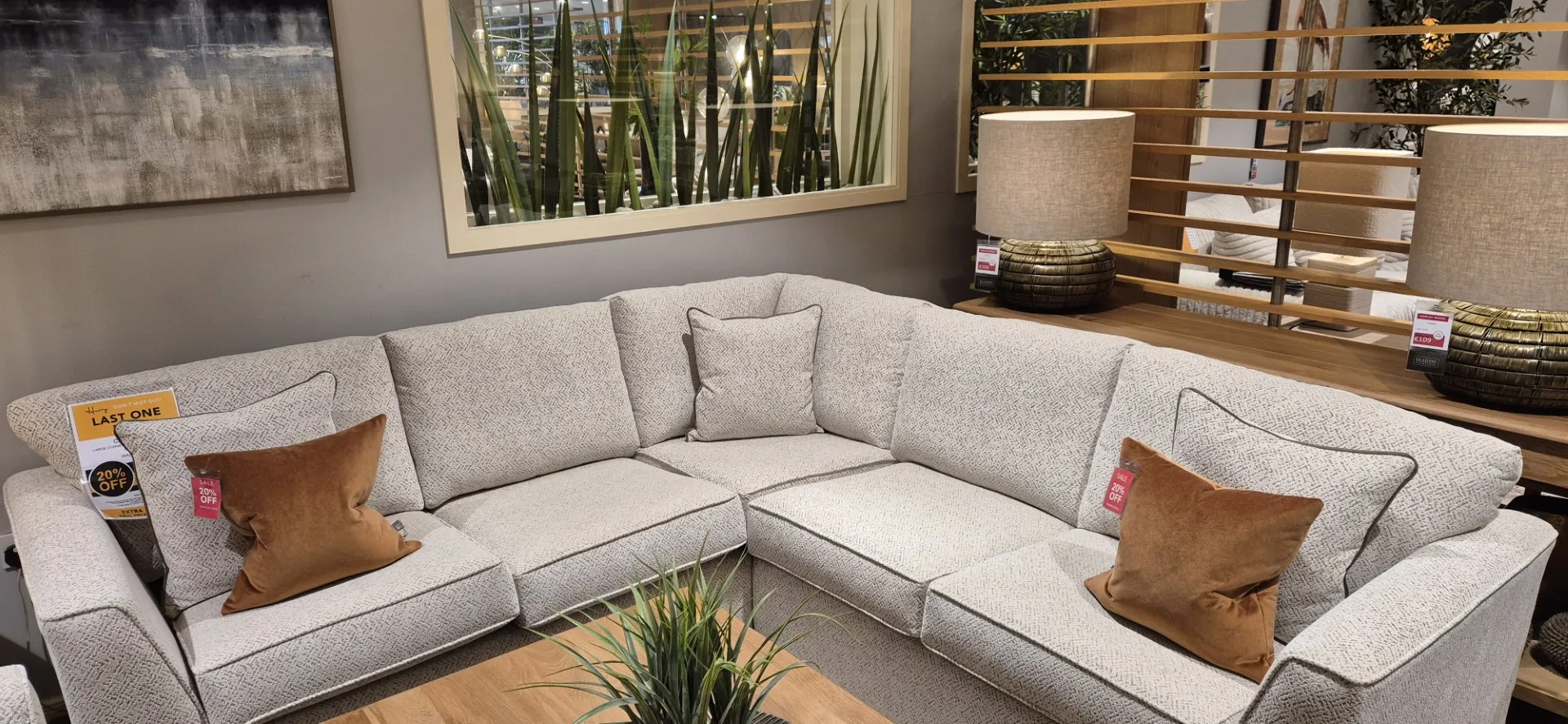 Carraroe Large Beige Fabric Corner Sofa & 2 Seater Beige Fabric Highback Sofa (Sligo Floor Model)