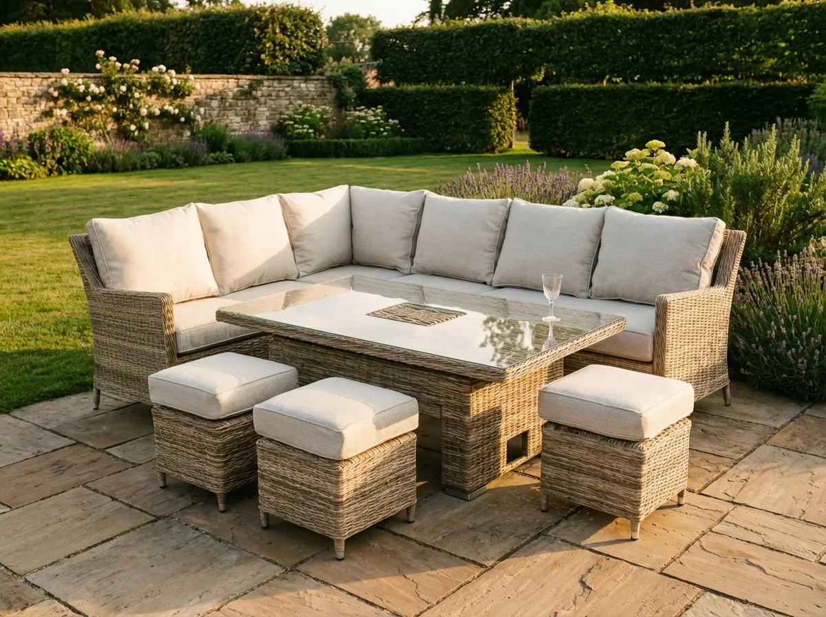 For effortless transition from casual lounging to elegant dining the Monterey Corner Garden Set features a unique glass-top rising table and 3 ottomans for extra diners