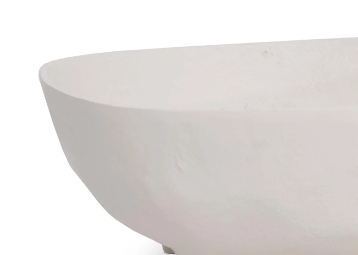 A large cream sleek dish with rounded edges perched on two slim legs.