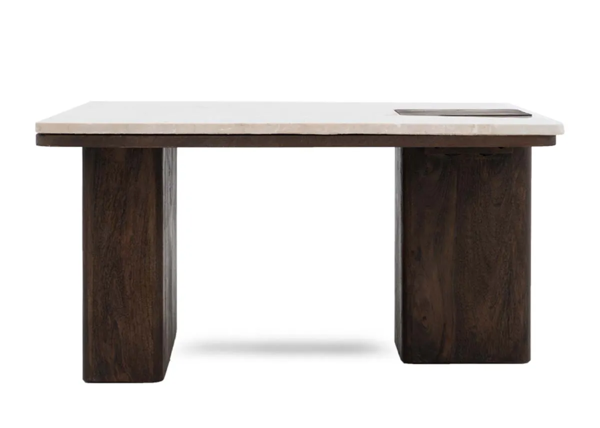 A square coffee table, modern with cream marble top and contrasting dark wood legs, a real feature piece.