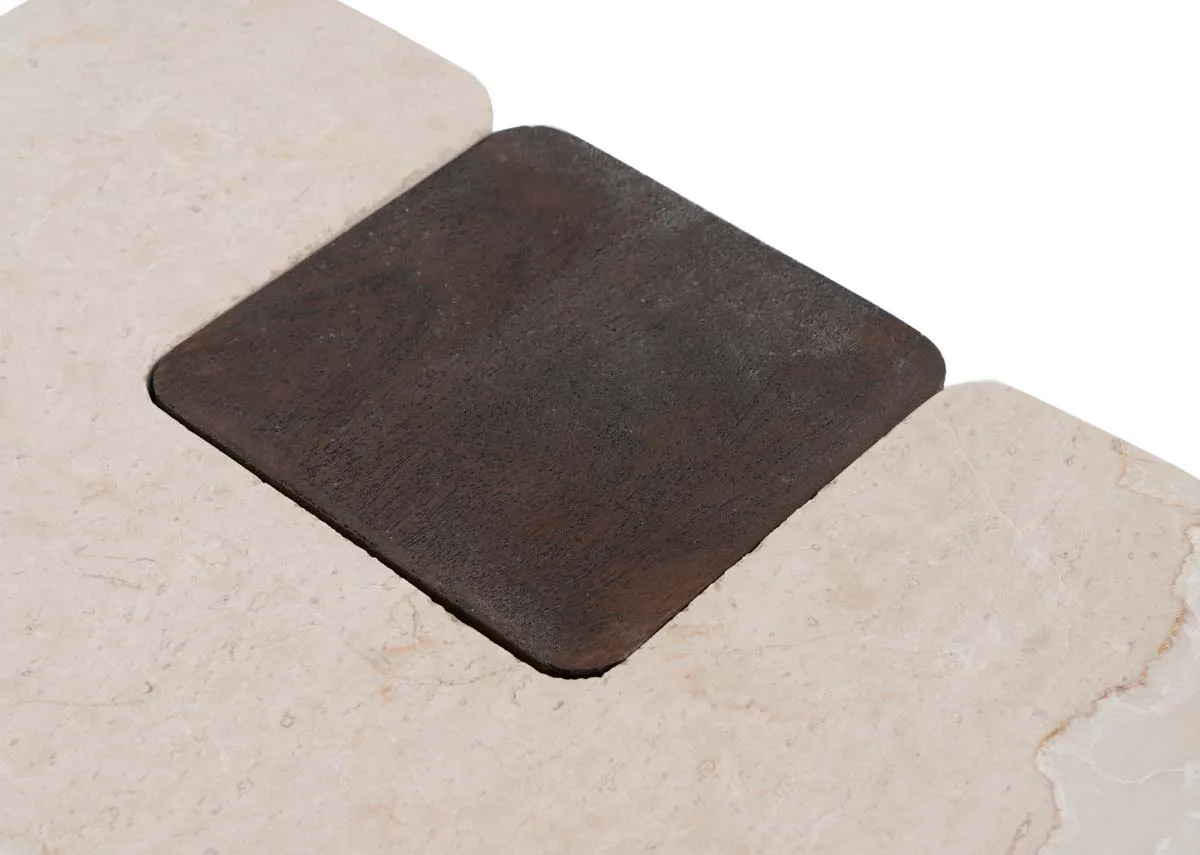 A long rectangular console table, modern with cream marble top and contrasting dark wood legs, a real feature piece.