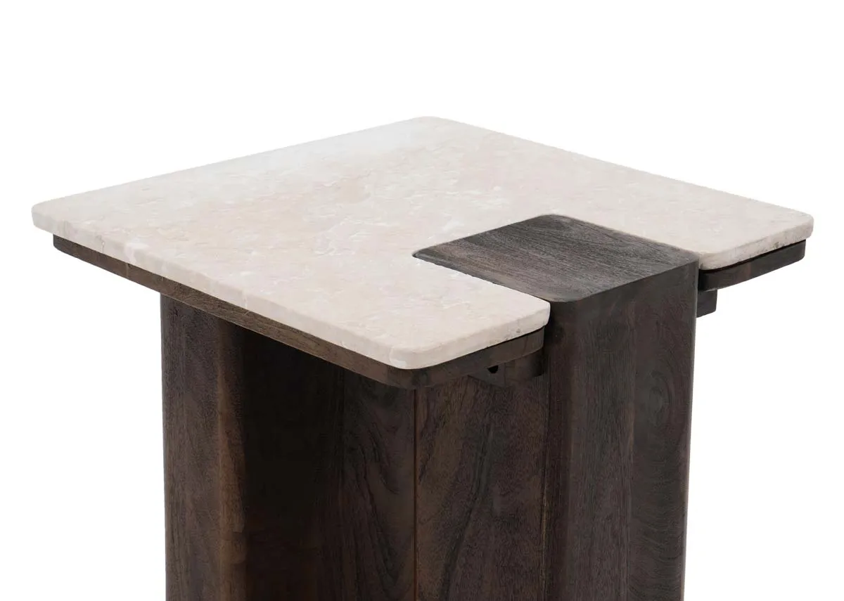 A rectangular side table, modern with cream marble top and contrasting dark wood legs, a real feature piece.