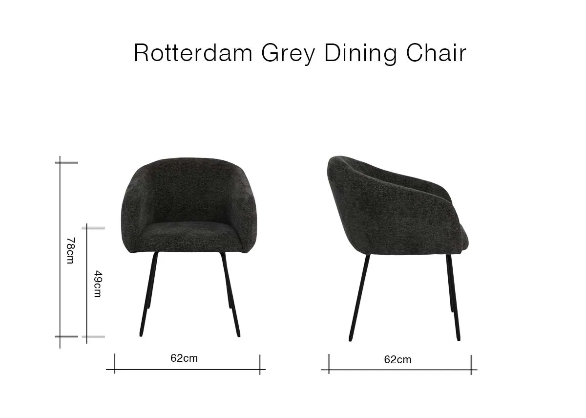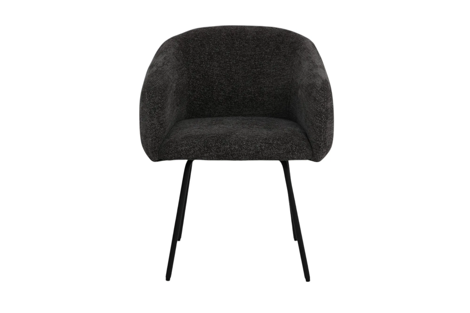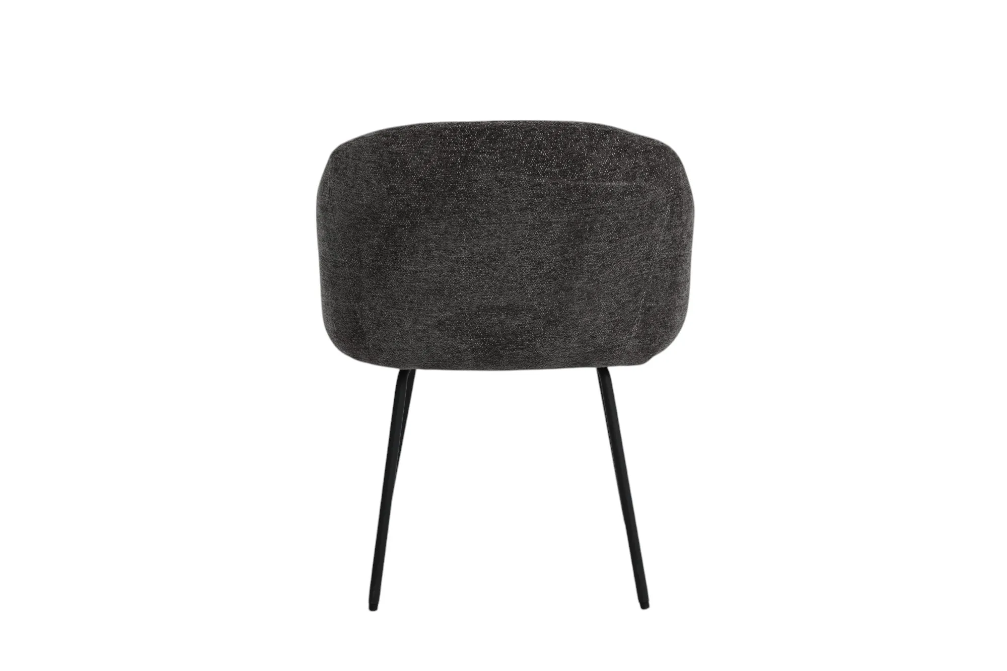 A curved dining chair with refined dark grey fabric upholstery high density foam seat & durable black metal legs.