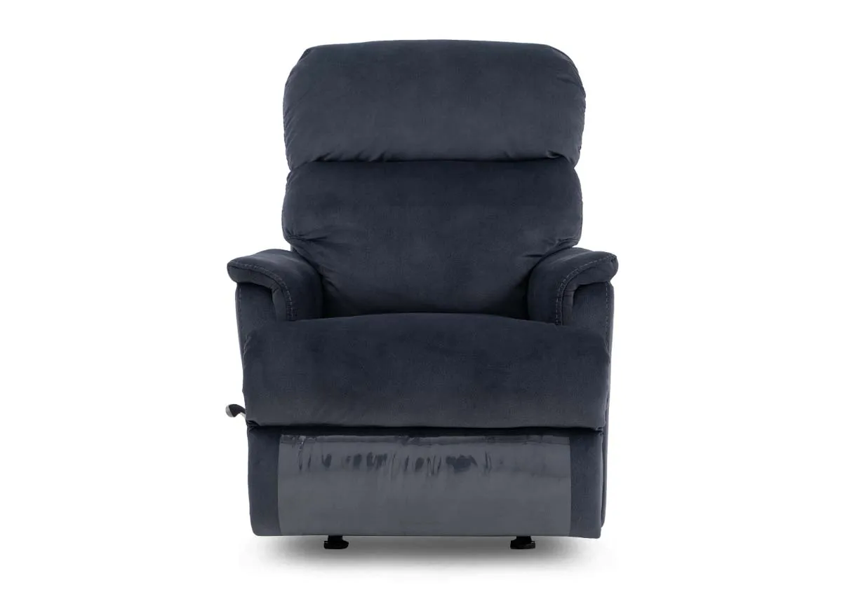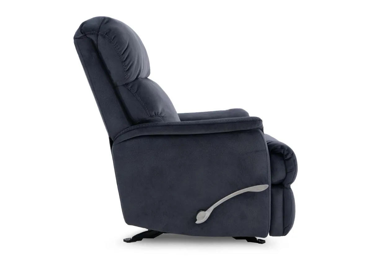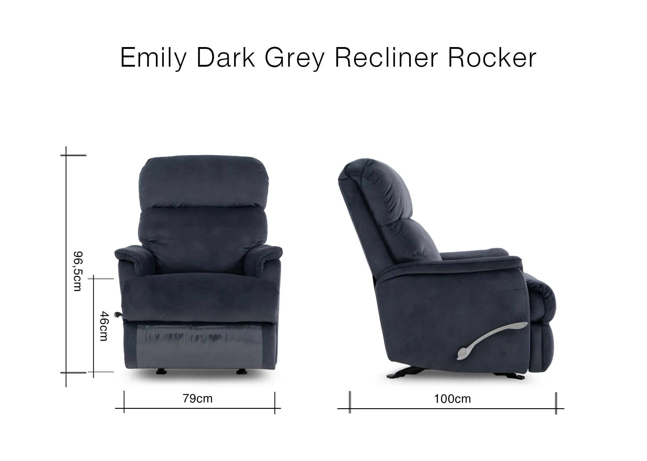 A dark grey fabric recliner rocker armchair with a manual silver lever, retro and comfy.
