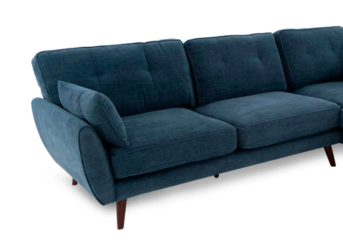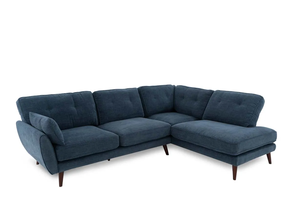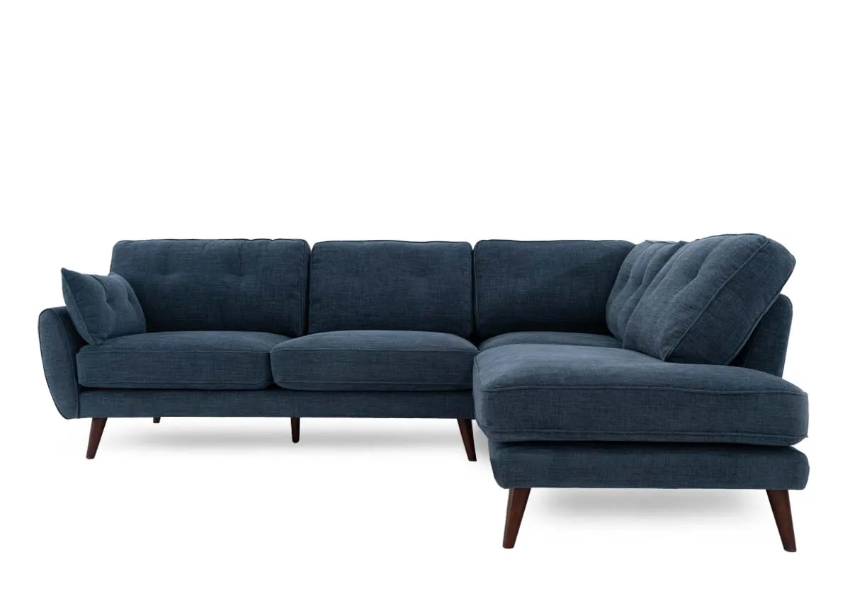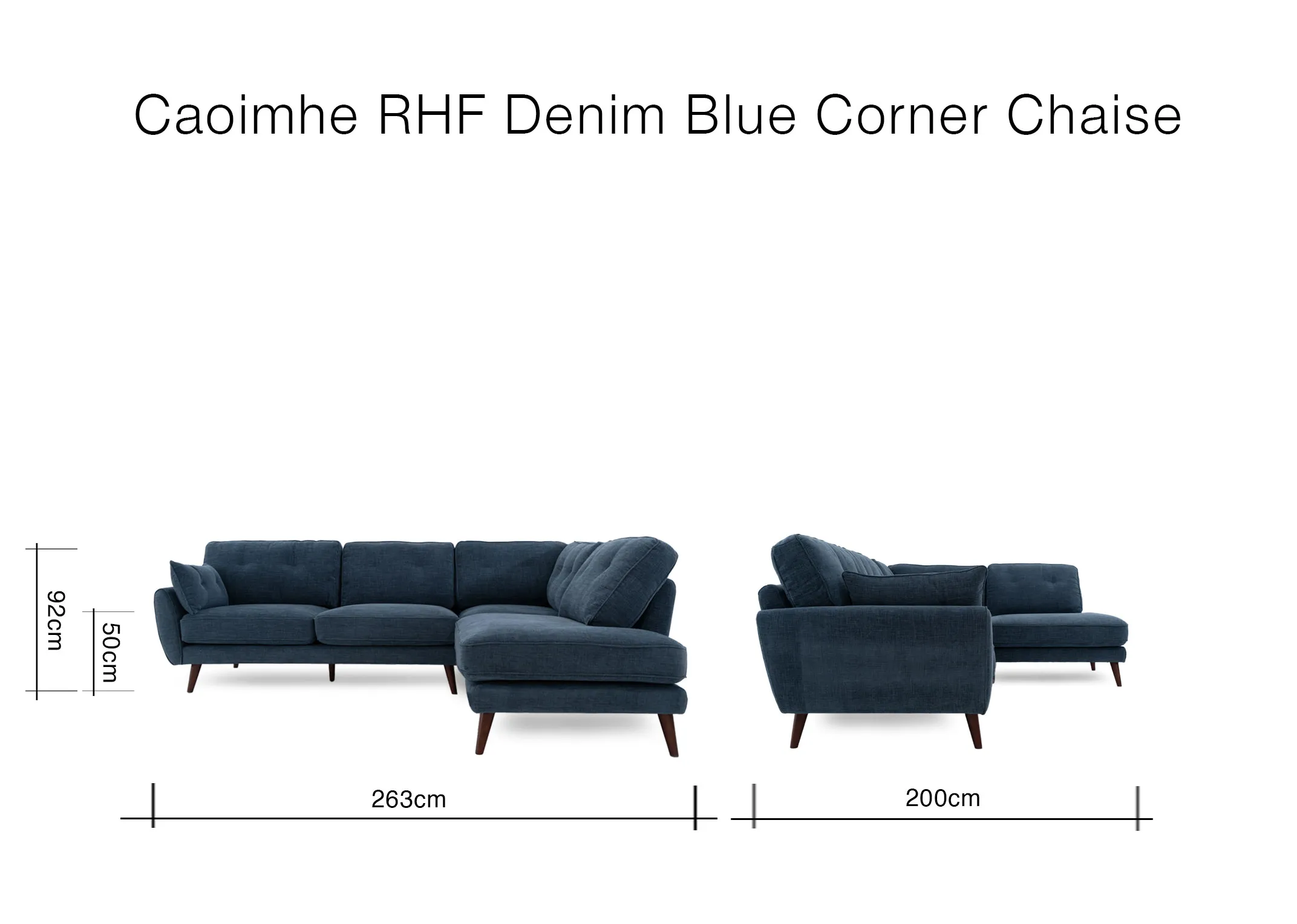 Casual but stylish, the Caoimhe denim RHF corner chaise has a deep seat, comfy cushions, and tufted details that enhance its retro style.