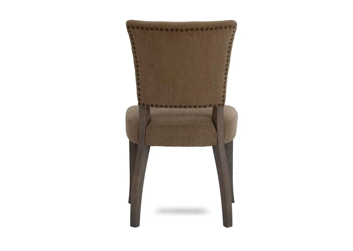 A gold herringbone fabric dining chair with foam filled seats and back with grey ash wood legs.
