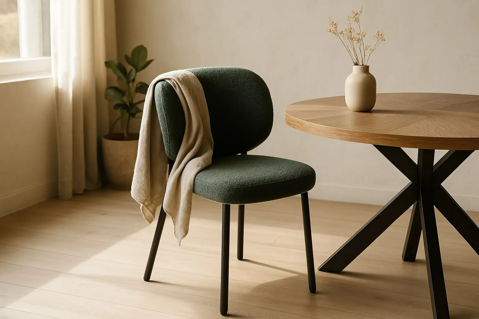 A green boucle dining chair with metal legs, versatile, comfy and oozing style.