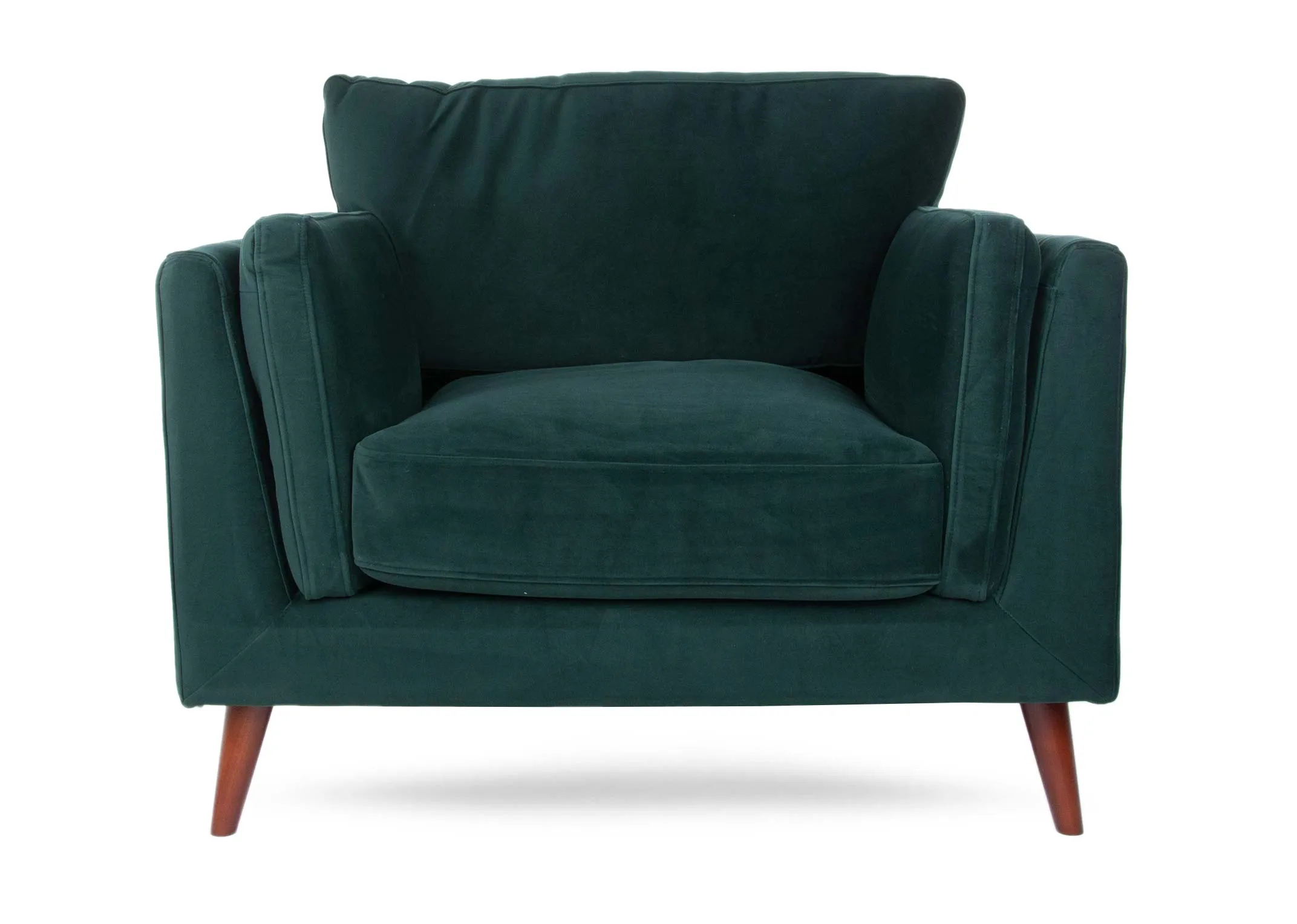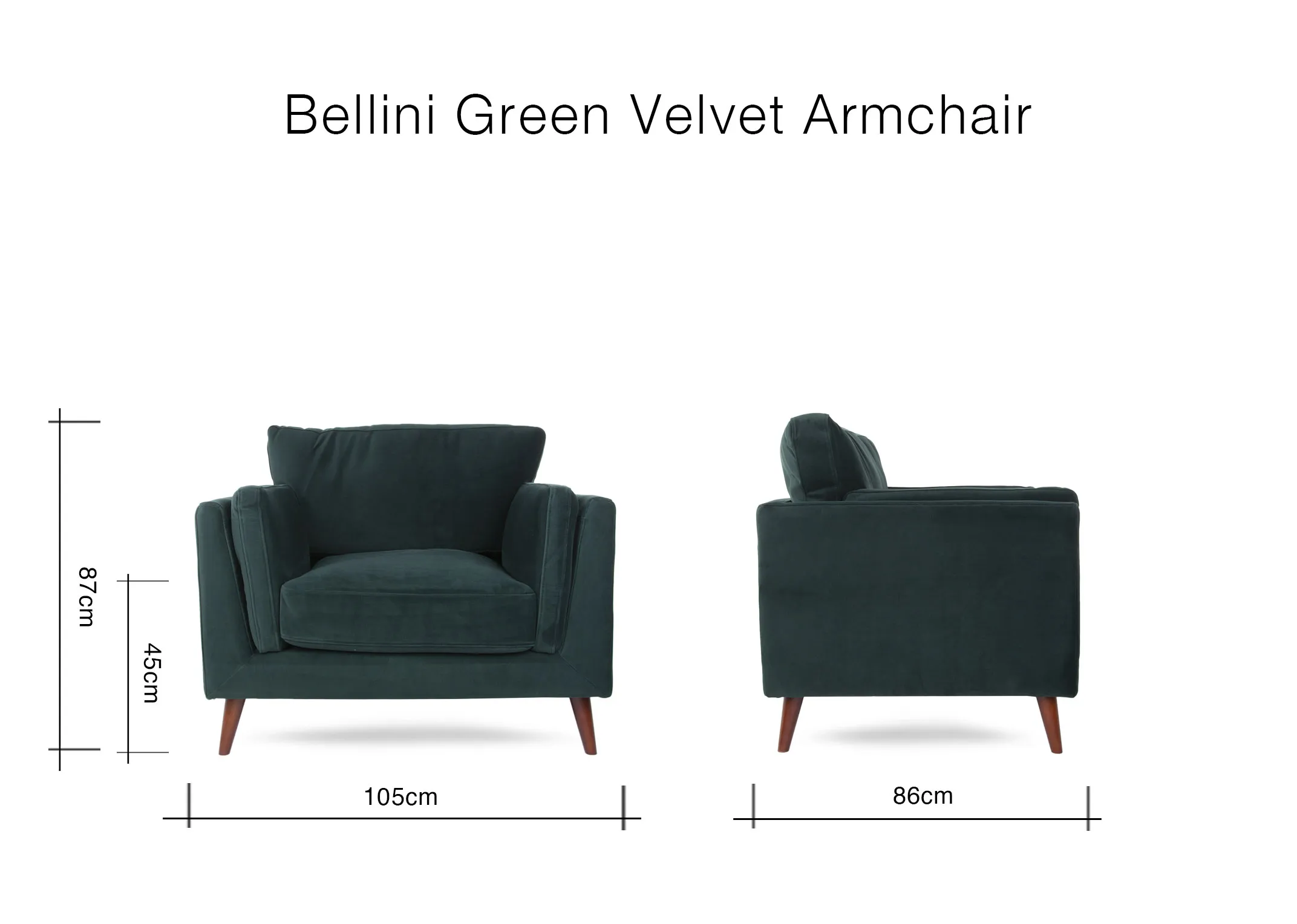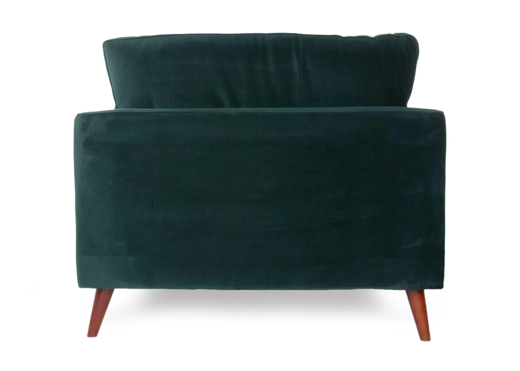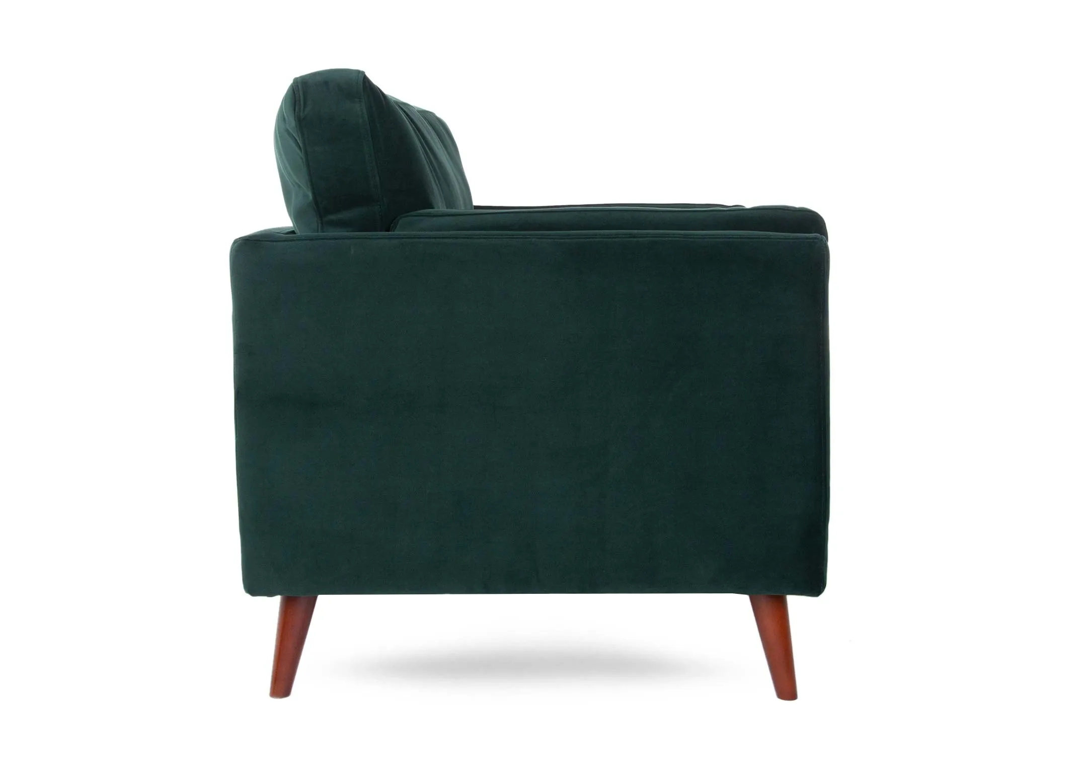Green velvet sofa with a mid-century design and sumptuous fabric. Features a deep green hue, a robust frame, and offers both comfort and style.