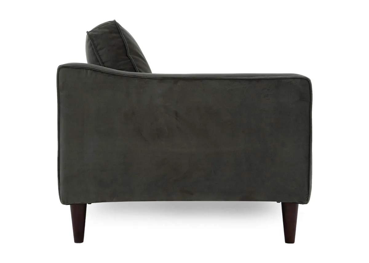 A rich green velvet fabric armchair with low back, clean lines and tufted button seat detail, 2 cylindrical bolsters all give this piece a retro feel.