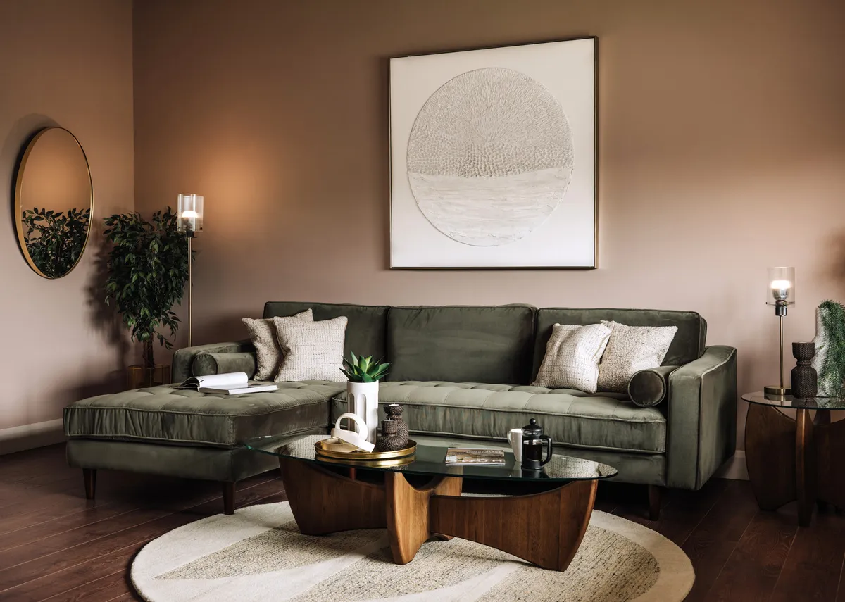 Boasting a sultry dark green blue velvet upholstery with a & tufted button detail on the seat & chaise this LHF Genoa has a retro vibe and luxurious feel.