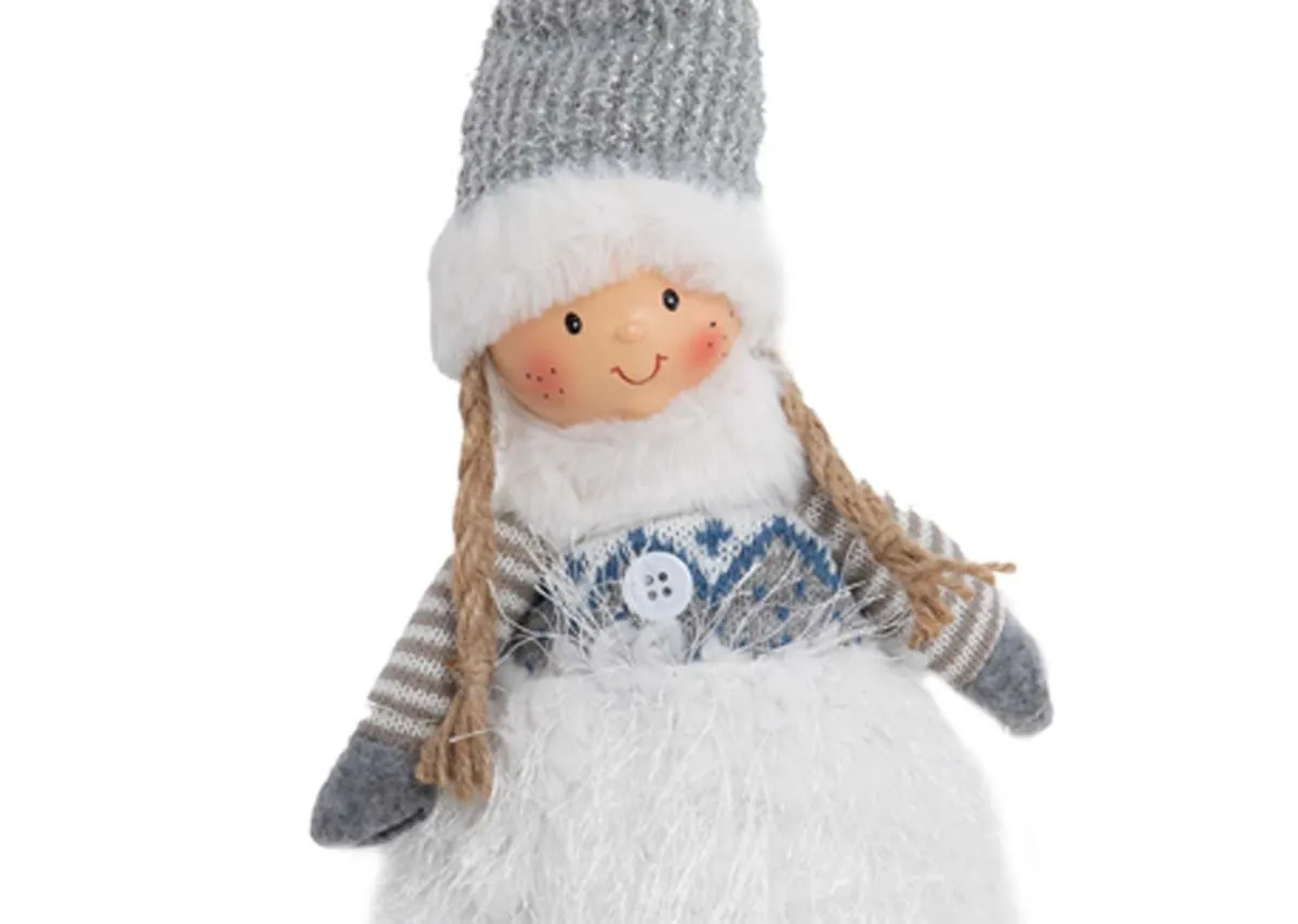 A Christmas Carol fabric young female character dressed in a grey nordic style hat white skirt and grey folding legs to sit on your mantle bookshelf or window.