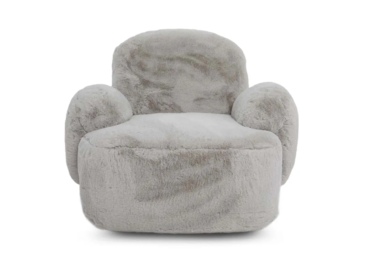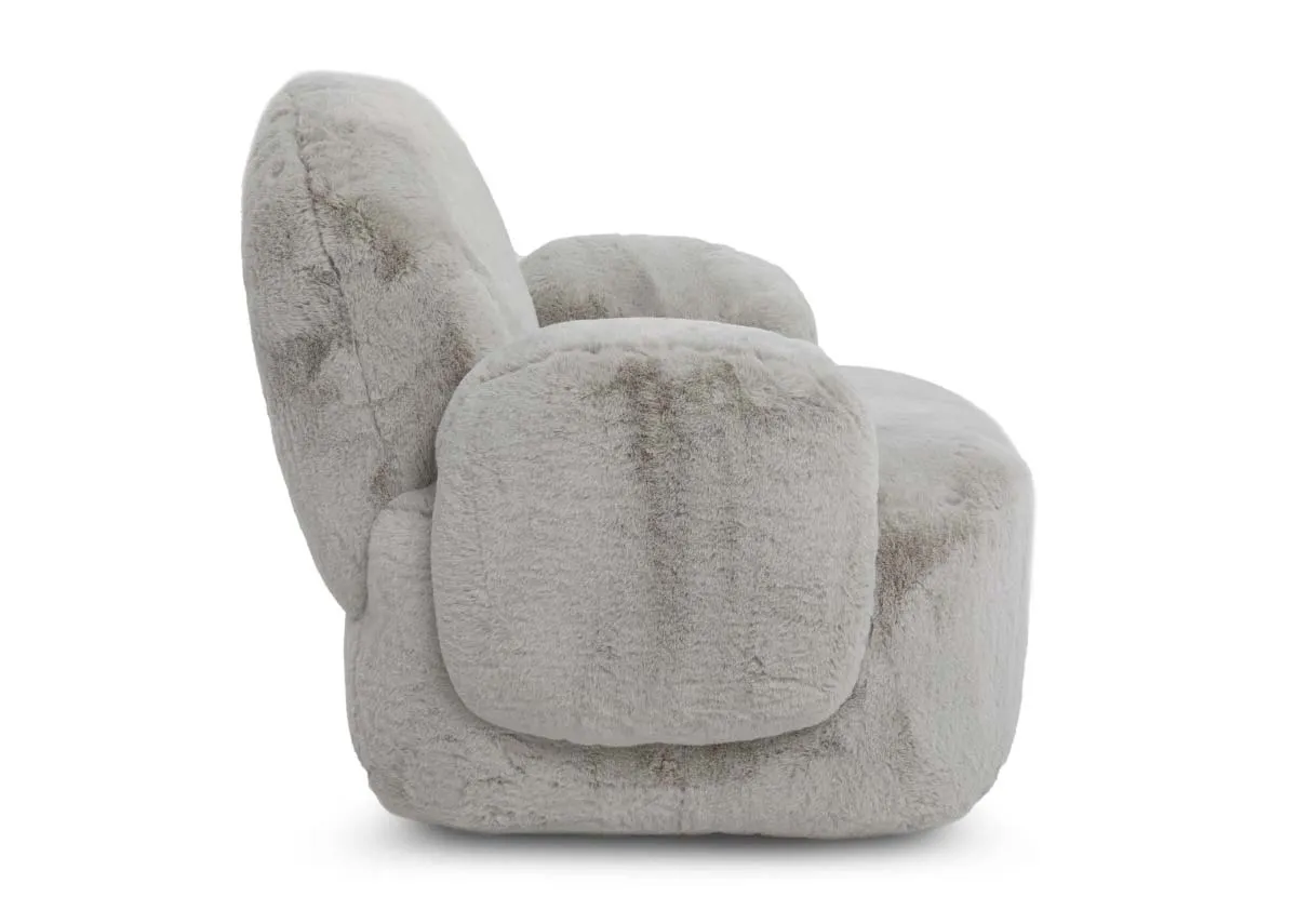 A curved swivel armchair upholstered in a light grey furry fabric and filled with high density foam filling for comfort.